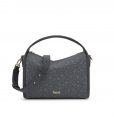 Bolso city mediano Kaos Mini Lines de lona con detalles de piel sintética en color gris oscuro. Cierre de cremallera. Bolsillo interior abierto. Asa fija de hombro y asa bandolera ajustable y desmontable. Medidas (alto x ancho x fondo): 22 x 28,5 x 15 cm.