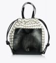 Bolso tipo cartera para mujer confeccionado en polipiel y tela de alta calidad, con forro interior. Cierre con botón magnético y cordón. Provisto de una correa desmontable/ajustable y se puede llevar cruzado. Cuenta con un compartimento interno con cremallera y otro externo con botón.