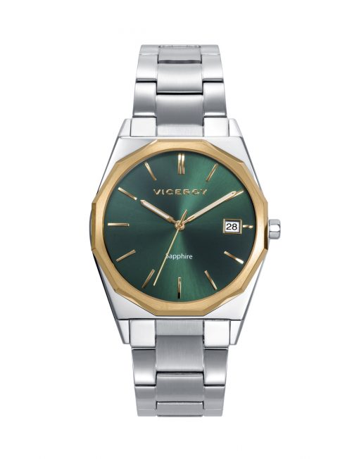 Reloj para hombre extraplano con cristal zafiro, caja y brazalete de acero, bisel dorado y esfera verde con el logo de Viceroy grabado en dorado. Las agujas de las horas y de los minutos cuentan con efecto "luminous". Una auténtica joya de Viceroy en busca de dueño.