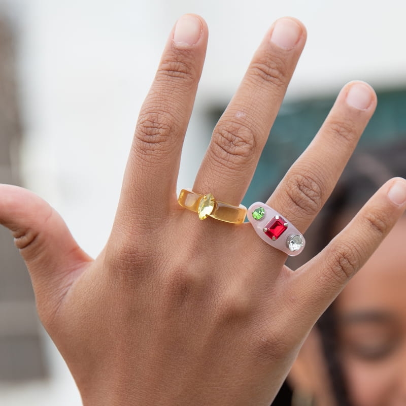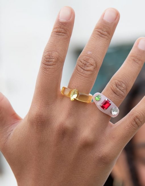 Anillo acrílico con piedras de cristal. Talla única.