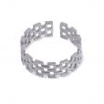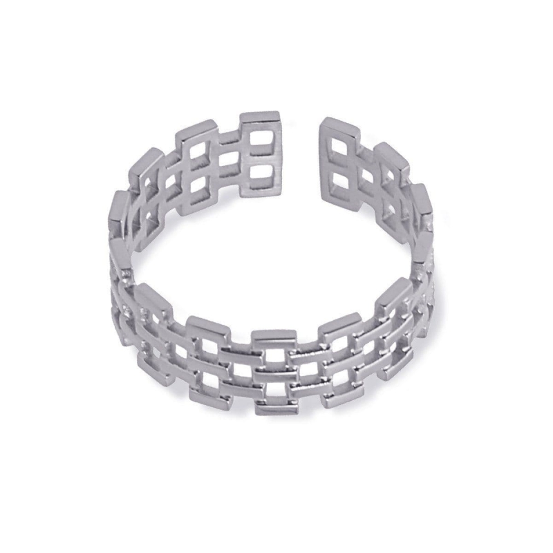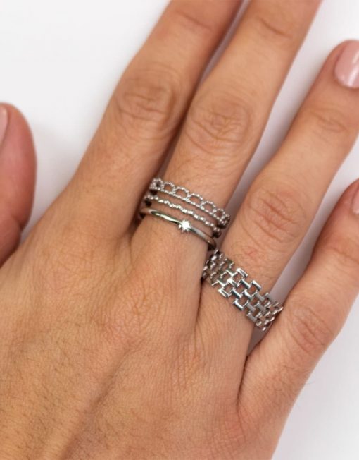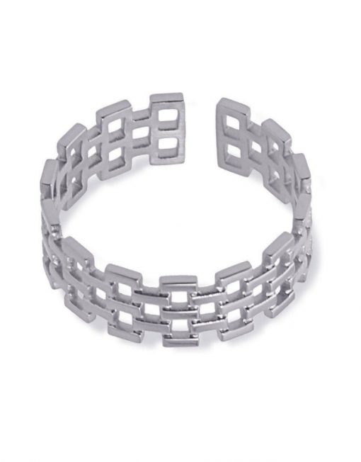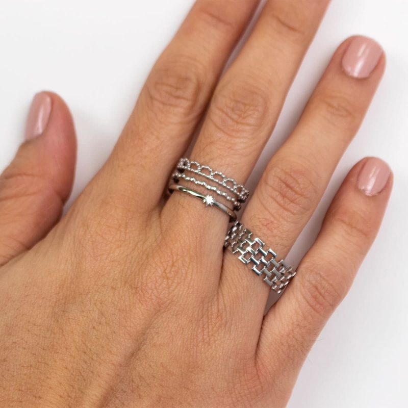 Anillo de acero quirúrgico con acabado pulido o baño de oro. Diseño geométrico y minimalista. Un imprescindible para captar la atención de tus manos. No produce alergia, se puede mojar y no oxida. Talla única ajustable. Detalles