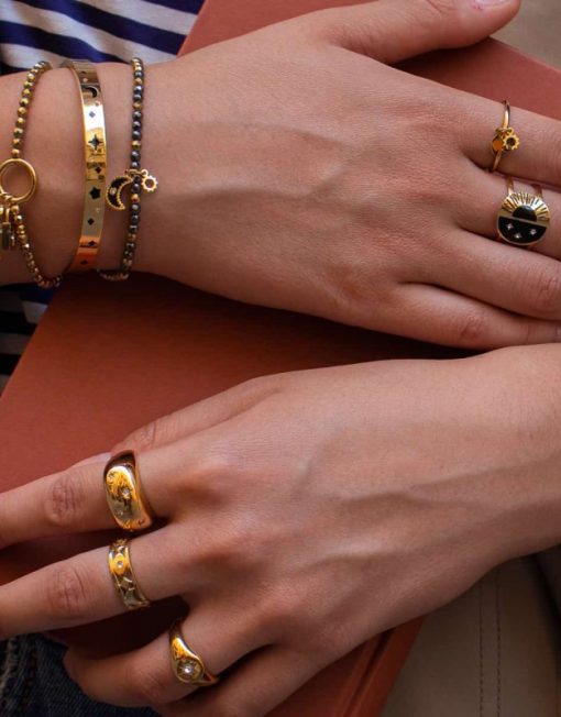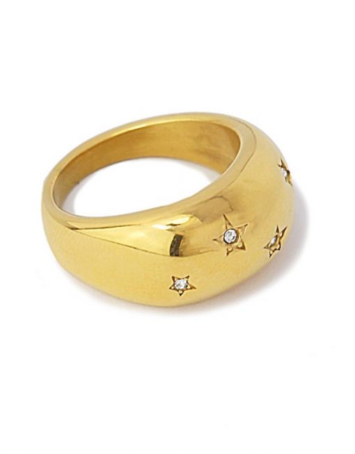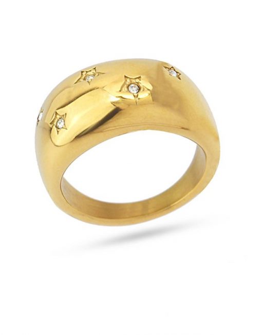Anillo grueso y redondeado de acero quirúrgico hipoalergénico en color dorado o plateado con mini estrellas con circonitas.Rotundo y llamativo, queda genial en looks de noche para marcar la diferencia. Brillante y favorecedor es el complemento perfecto a un brazalete grueso o un collar maxi. El regalo perfecto.
