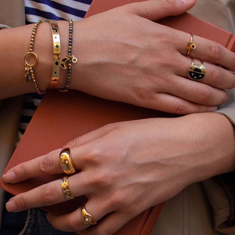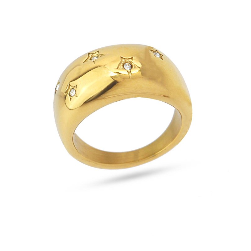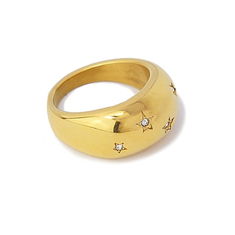 Anillo grueso y redondeado de acero quirúrgico hipoalergénico en color dorado o plateado con mini estrellas con circonitas.Rotundo y llamativo, queda genial en looks de noche para marcar la diferencia. Brillante y favorecedor es el complemento perfecto a un brazalete grueso o un collar maxi. El regalo perfecto.