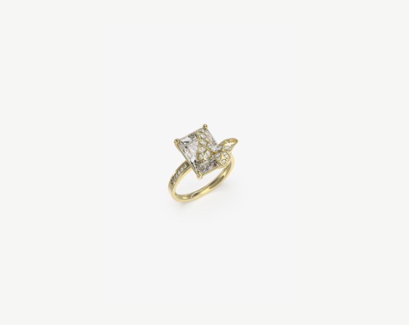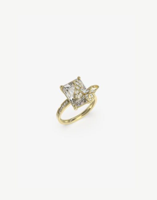 Anillo de acero de mujer de la marca Guess. Anillo de acero en dorado con piedra en blanco y mariposa con pedrería. Talla 52. La mariposa vuela en la colección CHRYSALIS para convertirse en el icono de una colección fresca y divertida a la par que elegante.
