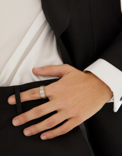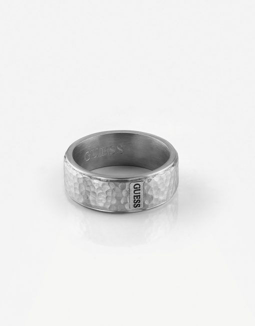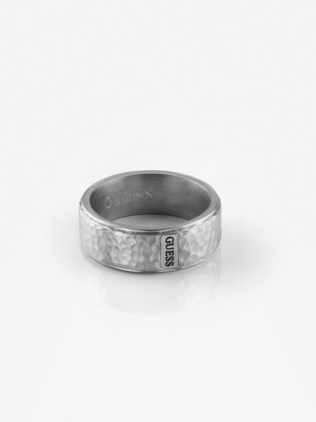 Anillo de acero enchapado. Estructura en banda. Superficie martillada con logo interior grabado.
