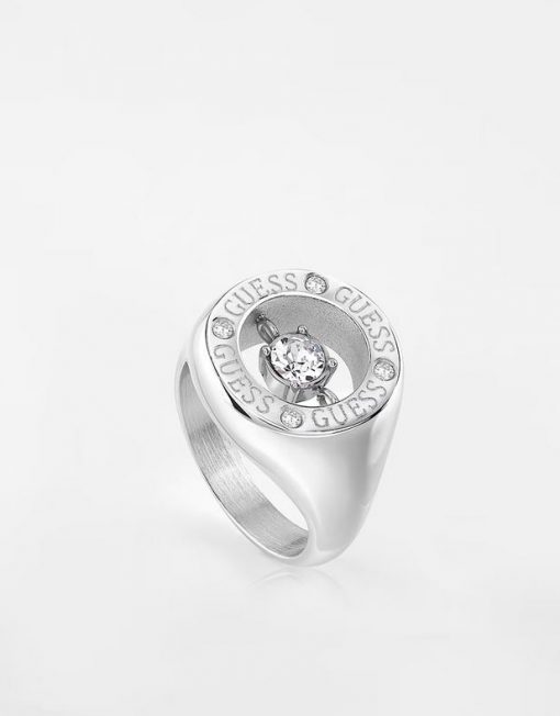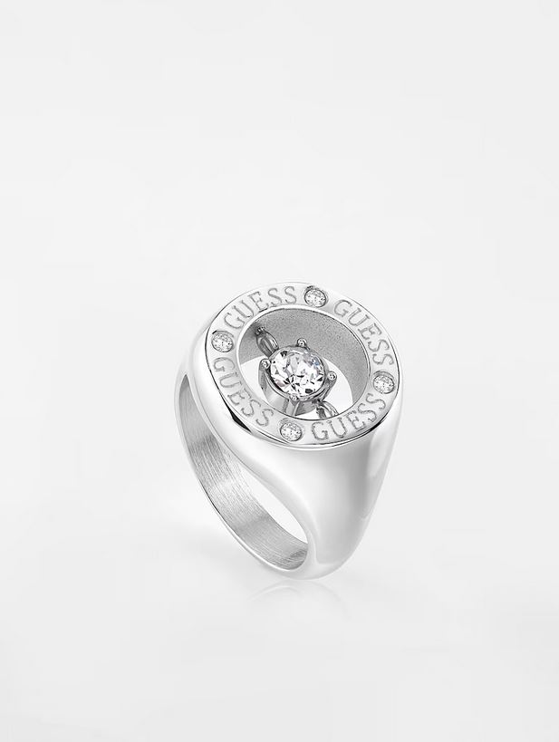Anillo de acero chapado. Estructura de banda. Aplicación de circonita cúbica central. Detalle grabado inscripción logotipo.