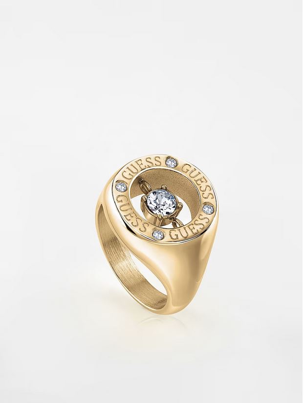 Anillo de acero chapado. Estructura de banda. Aplicación de circonita cúbica central. Detalle grabado inscripción logotipo.