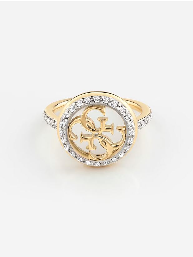 Anillo de acero enchapado. Estructura en banda. Medalla con logo 4G central. Aplicación de zirconia cúbica.