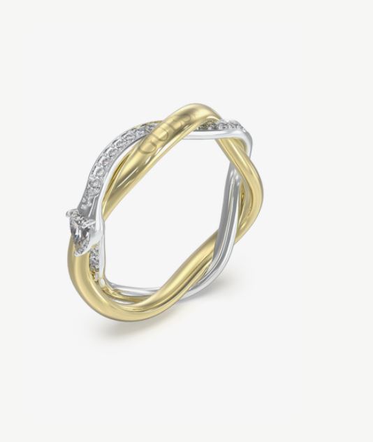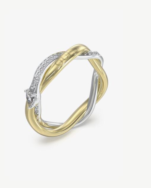 Anillo de acero para mujer de la marca Guess. Anillo de argolla bicolor plateado y dorado entrelazado con cristales blancos sobre el acero plateado, cristal más grande en forma de gota blanca y Guess grabado sobre acero dorado. Twist fusiona elegancia clásica con diseño contemporáneo, presentando enlaces entrelazados que capturan la luz y la atención. Cada pieza destaca por su sofisticación y versatilidad, convirtiéndose en el complemento perfecto.