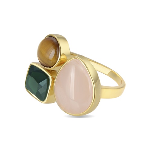 DETALLES ANILLO MIYA Piedras:CUARZO ROSA AcabadoBAÑO DE ORO AMARILLO DE 18 QUILATES Medidas:alto: 17.720, largo: 6.800 Peso:7.08 gr. Engaste:CHATON Tarjeta de colección:OPTIMISMO Material:PLATA DE LEY 925