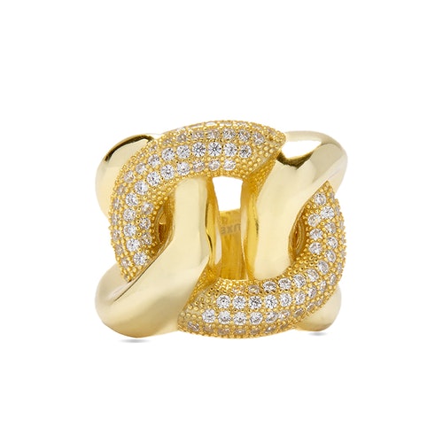 DETALLES ANILLO RUNGA Piedras:CIRCONITA BRILLANTE AcabadoBAÑO DE ORO AMARILLO DE 18 QUILATES Medidas:alto: 19.800, largo: 5.300 Peso:10.96 gr. Engaste:PAVE Tarjeta de colección:OPTIMISMO Material:PLATA DE LEY 925