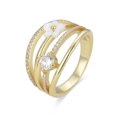 DETALLES ANILLO SAKRI Piedras:MADREPERLA BLANCA AcabadoBAÑO DE ORO AMARILLO DE 18 QUILATES Medidas:alto: 13.700, largo: 4.000 Peso:4.85 gr. Engaste:INVISIBLE Tarjeta de colección:OPTIMISMO Material:PLATA DE LEY 925