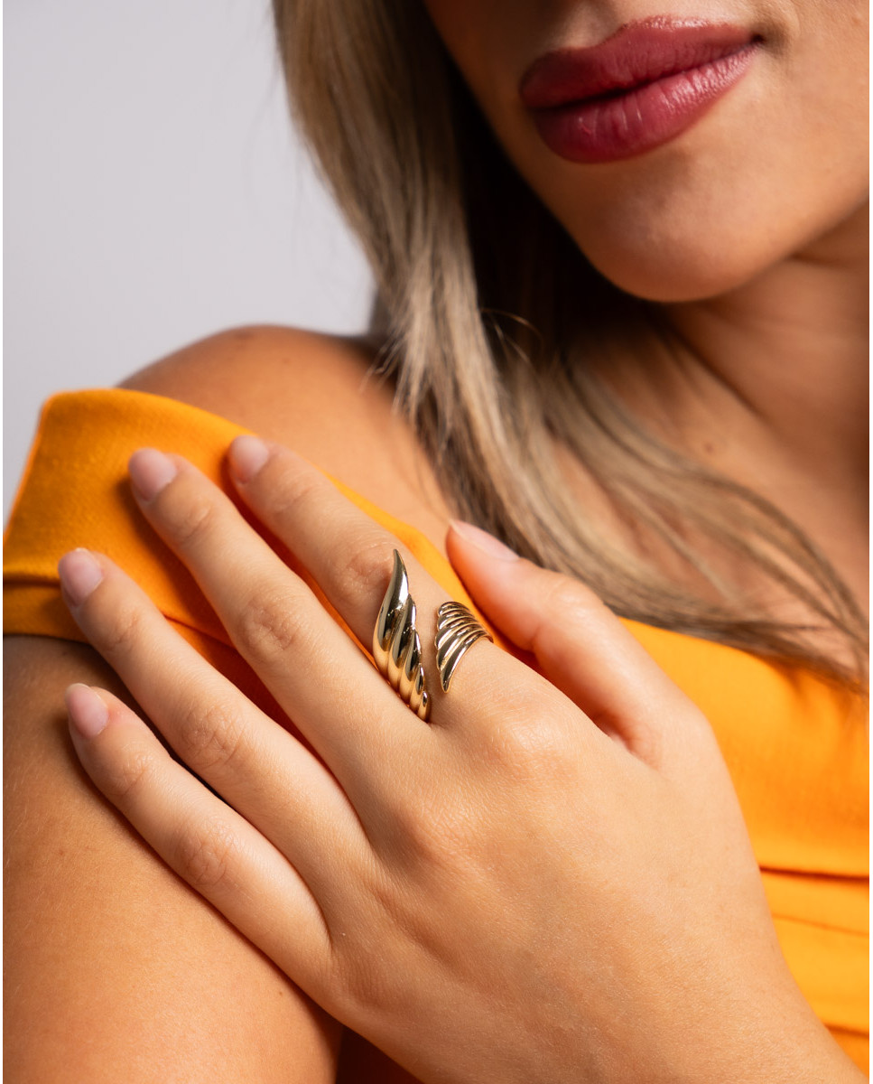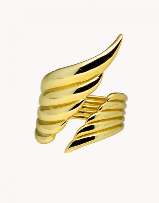 Anillo de plata de ley 925 bañada en oro 18K en forma de Ala. 3 mm de largo. Ajustable a diferentes medidas.