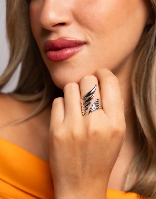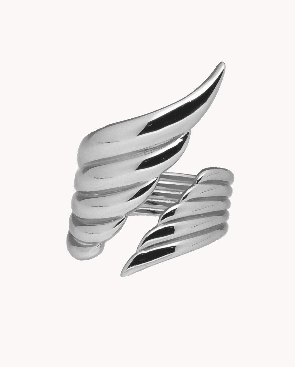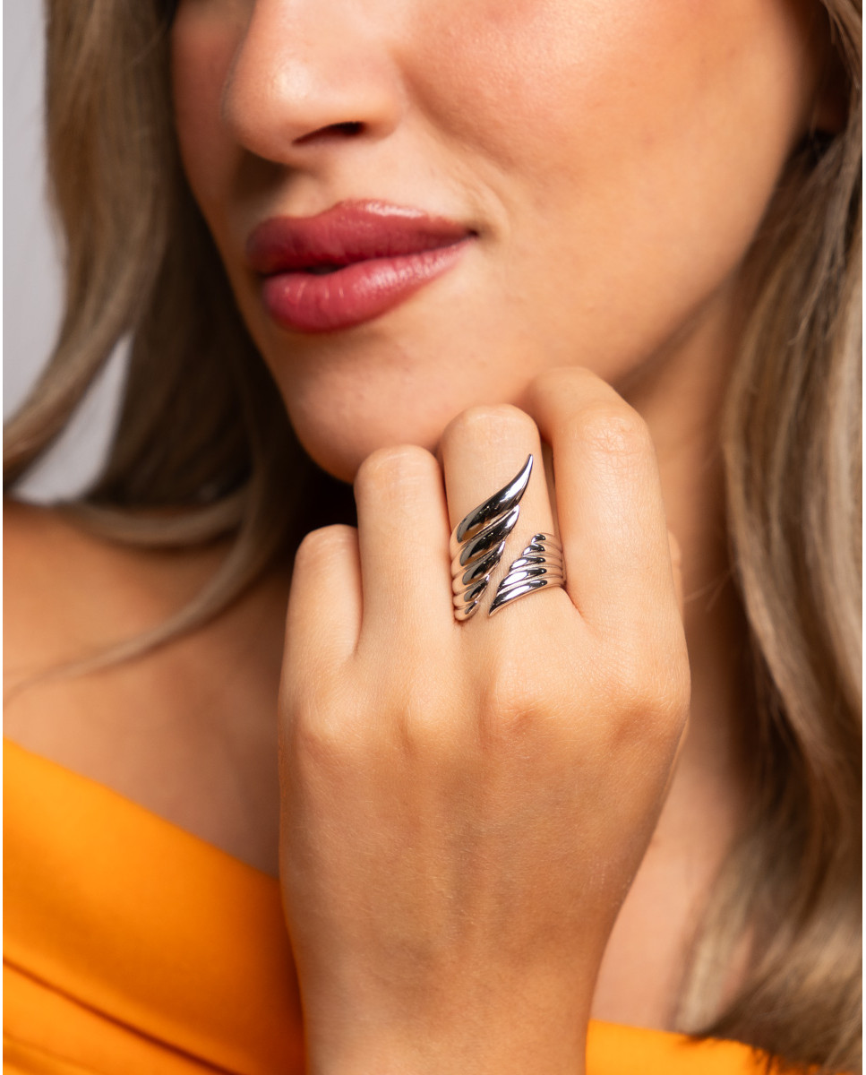 Anillo abierto de plata de ley 925 bañada en rodio en forma de Ala. 3 mm de largo. Ajustable a diferentes medidas.