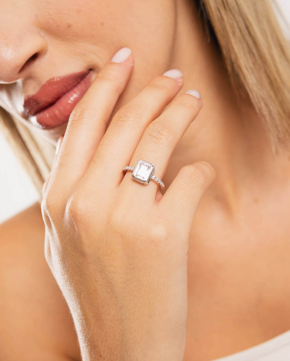 Anillo de plata de ley 925 bañada en rodio con circonita central blanca de 5 mm x 8 mm (ancho por alto) y carril de circonitas blancas en ambos laterales.