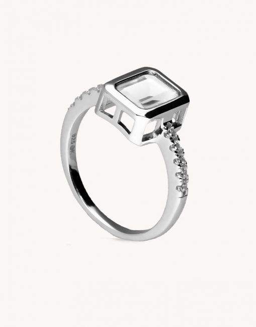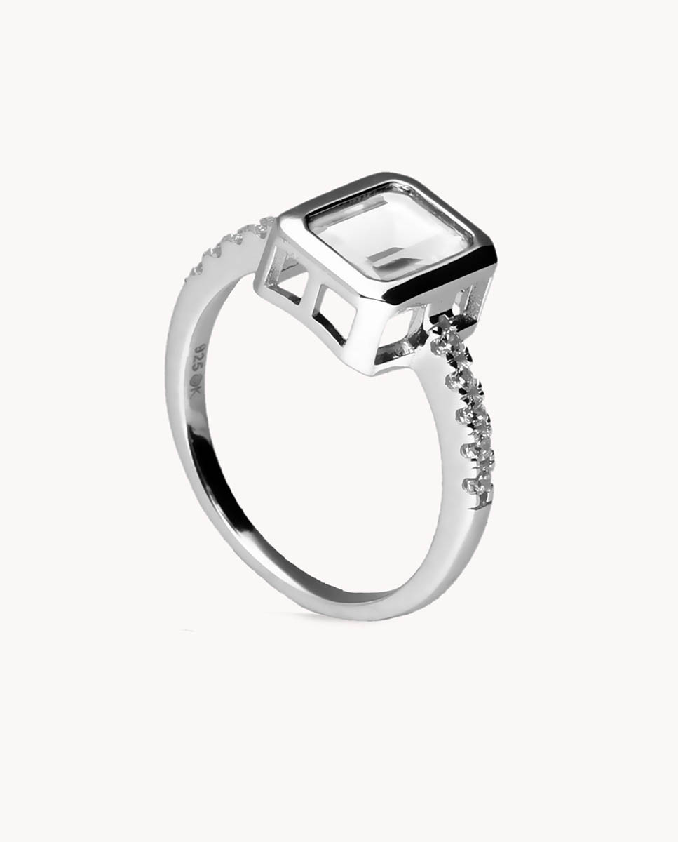 Anillo de plata de ley 925 bañada en rodio con circonita central blanca de 5 mm x 8 mm (ancho por alto) y carril de circonitas blancas en ambos laterales.