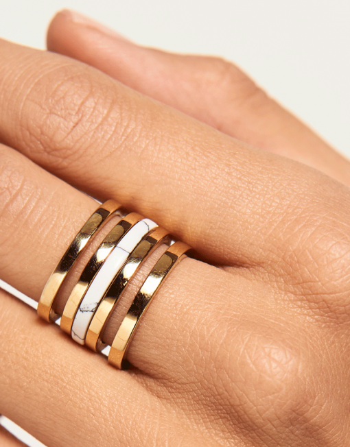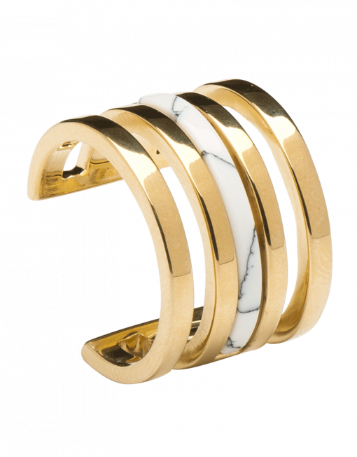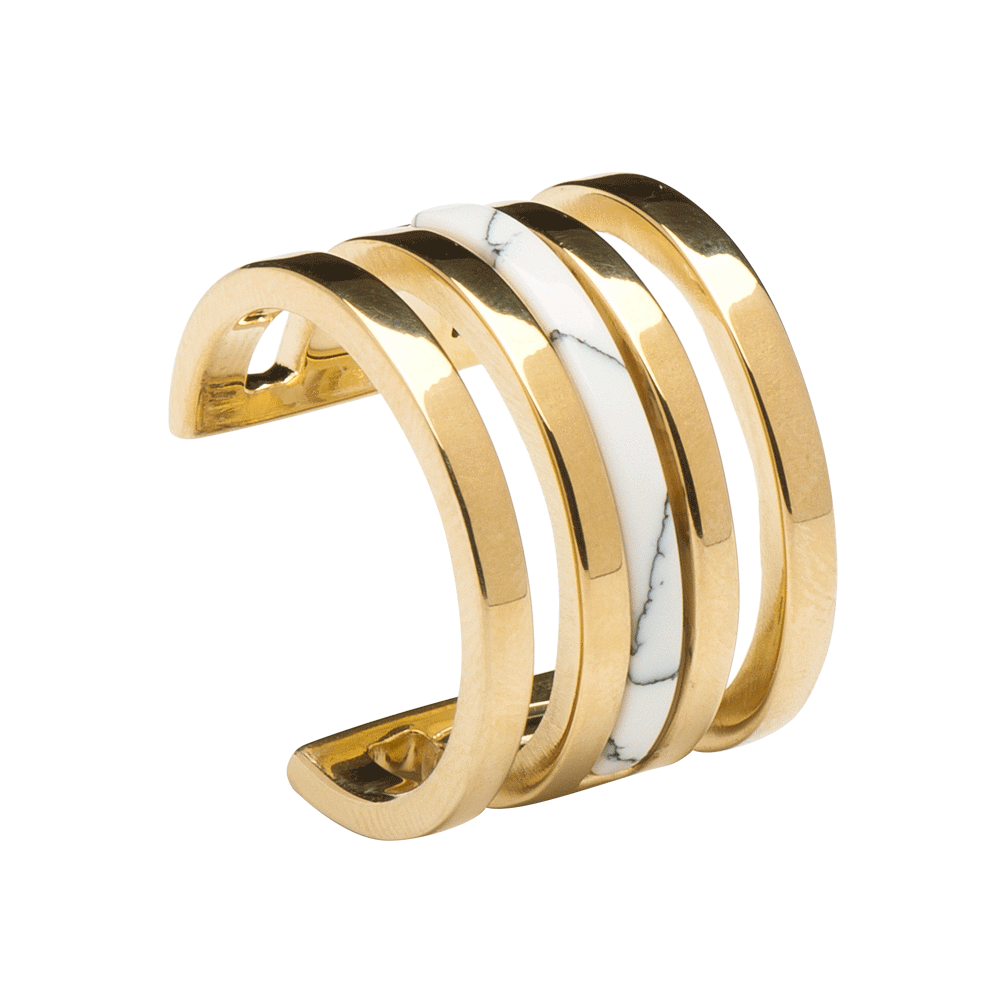 La innovación se manifiesta en el acabado mármol de la imponente pieza curvada de howlite que se rodea de un anillo bañado en oro de 18 quilates.
