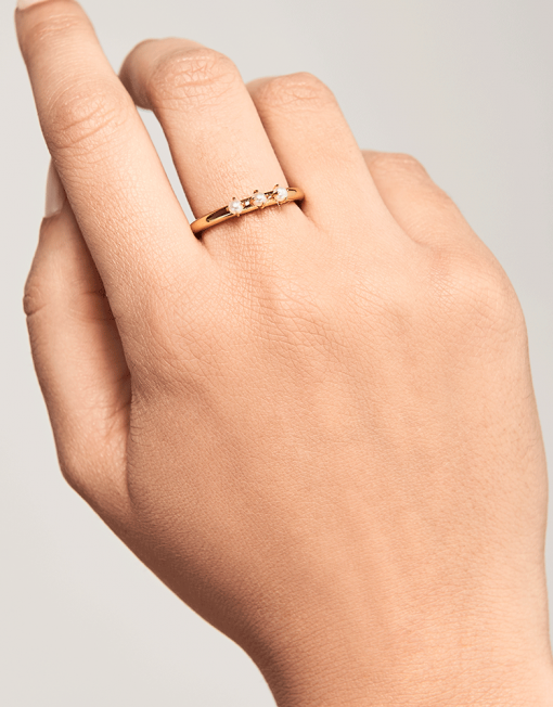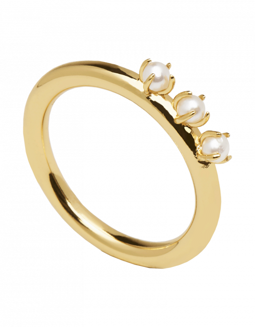 Destacan tres perlas naturales que coronan una sección tubular aportando luz a tus manos. El anillo Francine gold es de plata de ley 925 y está bañadop en oro de 18 quilates.