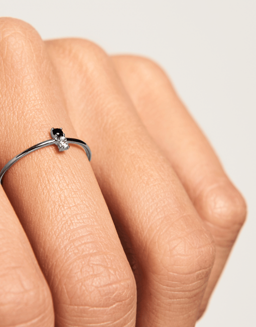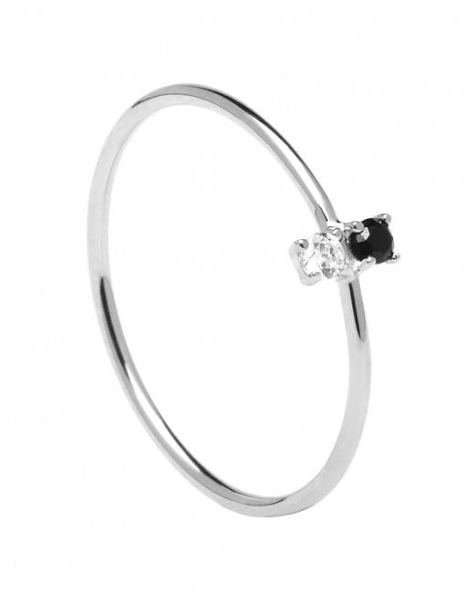 Este elegante y fino anillo de plata de ley 925 juega con la dualidad de dos circonitas que ponen en contraste el blanco y el negro.
