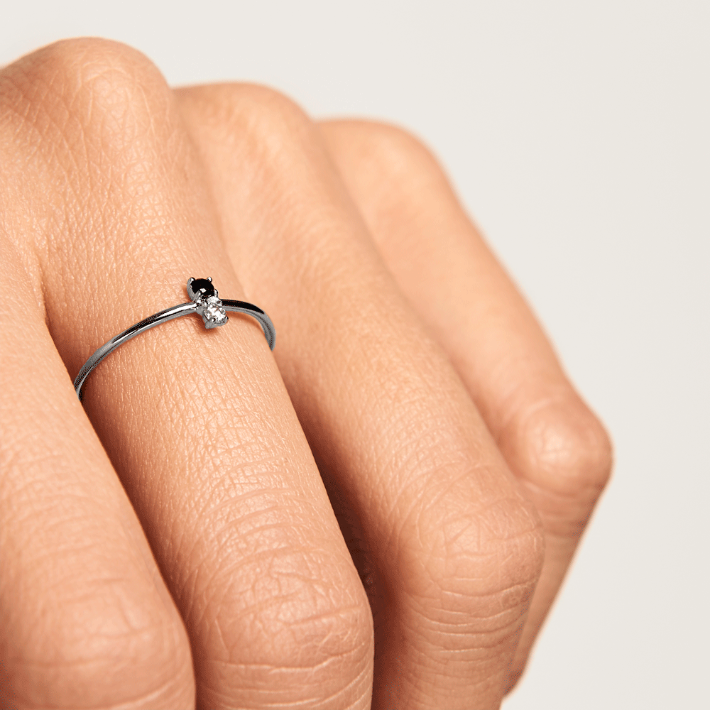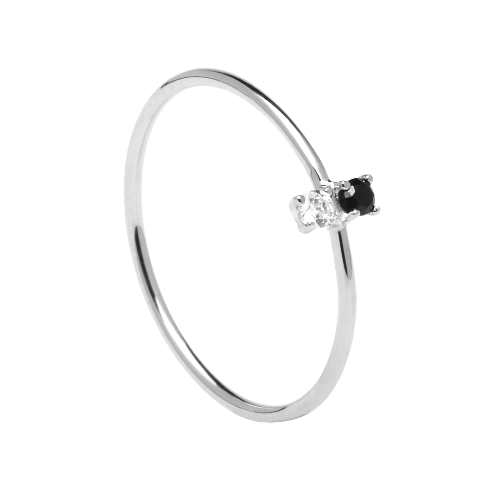 Este elegante y fino anillo de plata de ley 925 juega con la dualidad de dos circonitas que ponen en contraste el blanco y el negro.