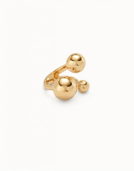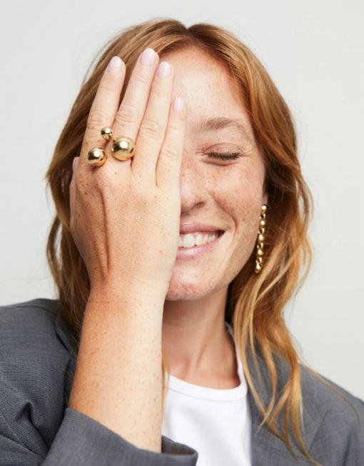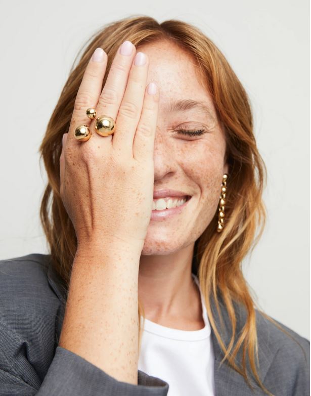 Este anillo abierto bañado en oro destaca por su diseño orgánico, compuesto por tres burbujas redondeadas de diferentes tamaños. Una composición fluida y atrevida que transforma el volumen en actitud.