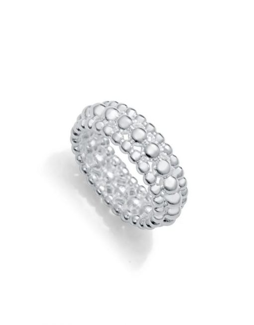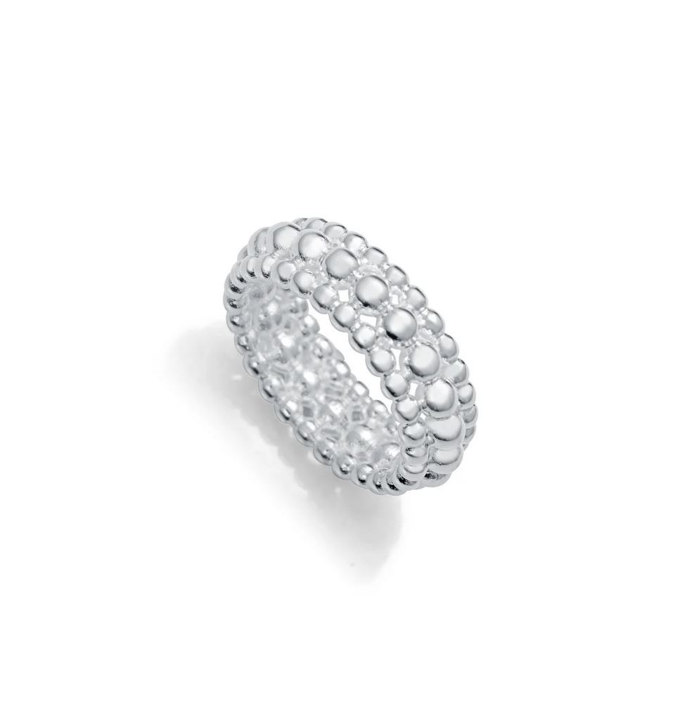 El anillo de acero ancho medio chapado en plata 999 de la colección de Laura Escanes que resalta por su originalidad y elegancia. Su estructura con bolas en relieve le da una textura única, convirtiéndolo en un accesorio sofisticado y versátil.