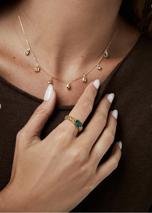 Un anillo que combina delicadeza y originalidad en un diseño lleno de encanto. Elaborado en plata de primera ley con un refinado baño de oro, destaca por su acabado calado que aporta ligereza y sofisticación a la pieza. En el centro, una circonita baguette en tono verde se convierte en la protagonista, aportando frescura, vitalidad y un destello de color que contrasta con la calidez del dorado. Es una joya que transmite estilo y distinción, pensada para mujeres que buscan piezas únicas que reflejen elegancia y personalidad en cada detalle.