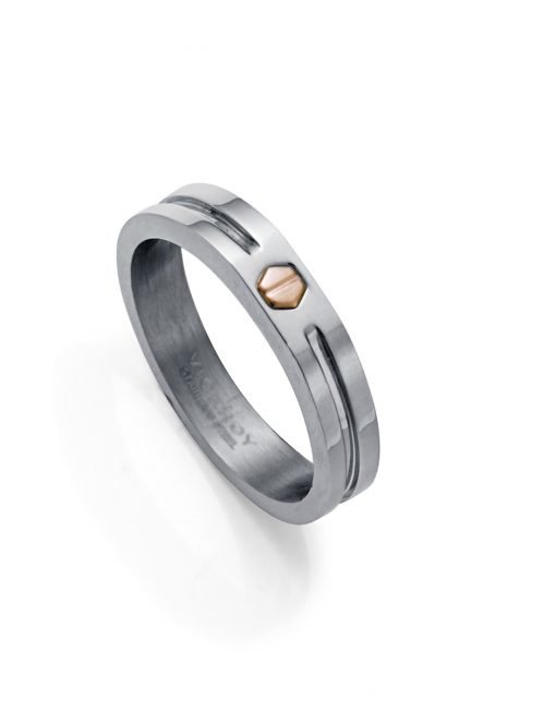 Un anillo que refleja fuerza y elegancia en cada detalle. Fabricado en acero inoxidable, este anillo de hombre destaca por su diseño audaz y moderno, con un tornillo de oro rosa de 9k que añade un toque de lujo y distinción. Su combinación de acero y oro rosa lo convierte en una pieza versátil que puede complementar tanto looks casuales como más formales. Disponible en tallas 20, 22, 24 y 26, es el accesorio perfecto para el hombre que busca una joya robusta, sofisticada y llena de personalidad.