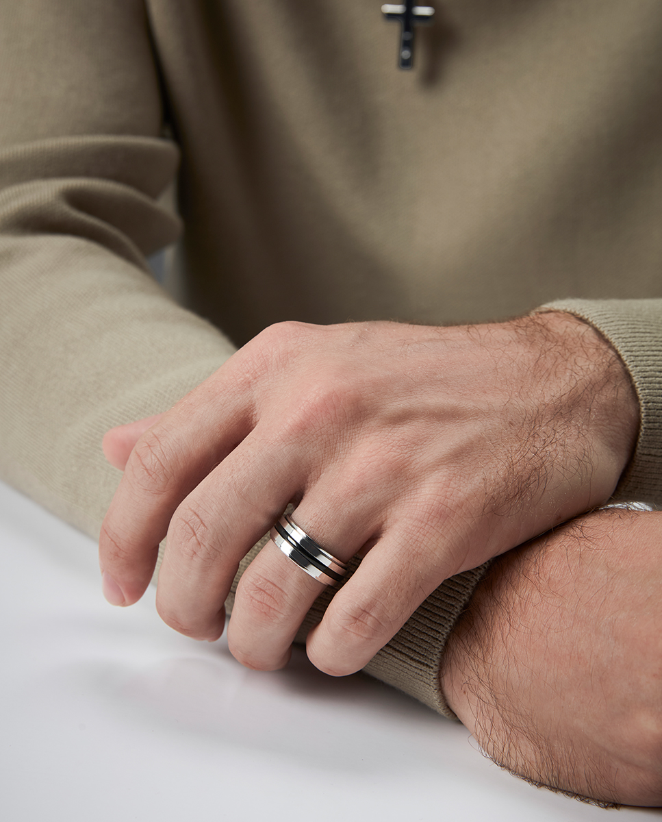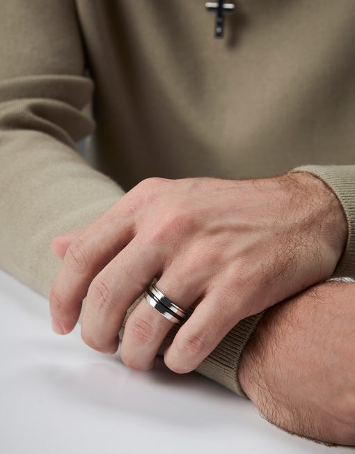 Un anillo que combina funcionalidad y estilo moderno en un diseño único. Fabricado en acero con acabado IP negro, este anillo rotatorio presenta un toque de distinción y dinamismo, ideal para el hombre que busca una joya audaz y práctica. El diseño rotatorio añade un detalle interactivo que lo hace aún más interesante y contemporáneo. Disponible en tallas 20, 22, 24 y 26, es una pieza versátil que puede complementar cualquier look con un toque de sofisticación y personalidad. Perfecto para hombres que desean un accesorio único que combine estilo, funcionalidad y carácter.
