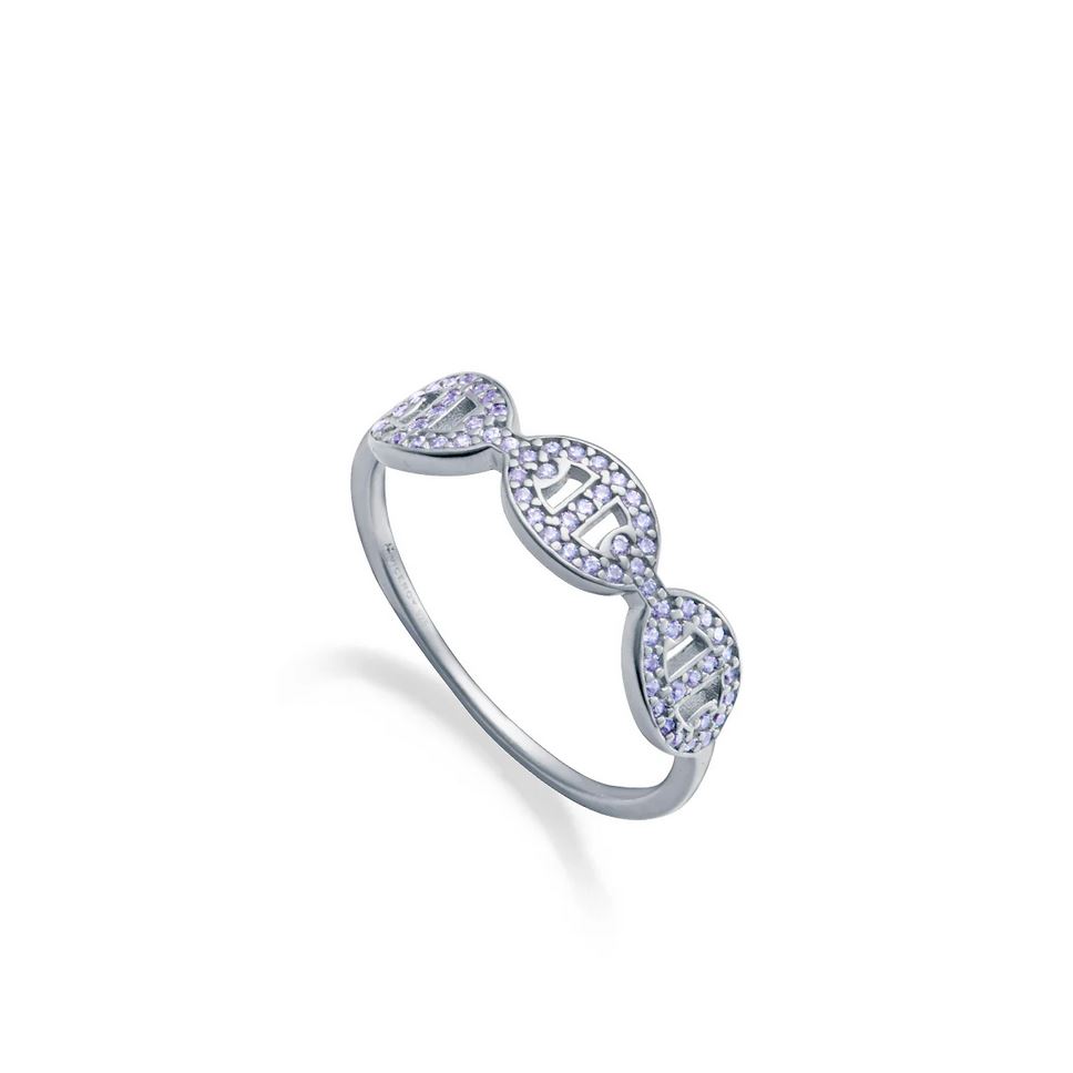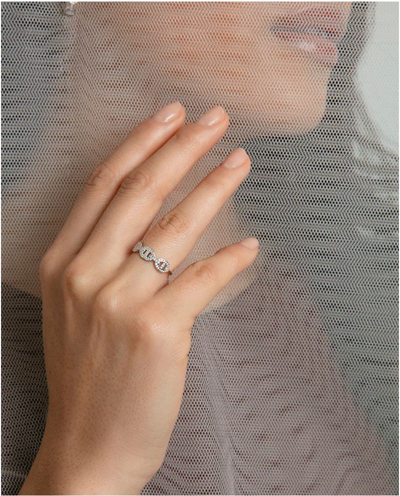 La esencia del diseño calabrote cobra vida en este anillo de plata de primera ley con baño de rodio. Sus eslabones, adornados con circonitas blancas, aportan un brillo sutil que equilibra modernidad y sofisticación.