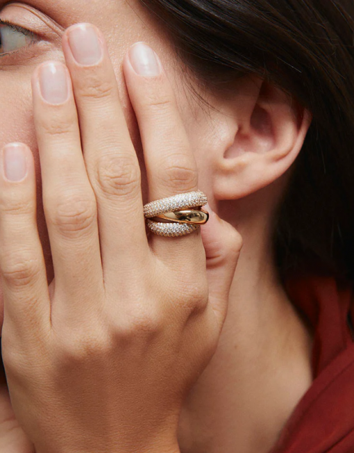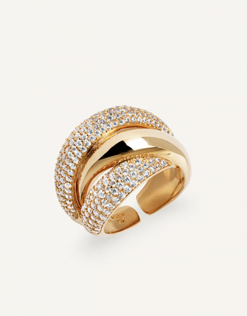 Anillo ancho cruzado Délum bañado con una gruesa capa de oro macizo de 18 kt, lo que garantiza una mayor durabilidad. Engastado con circonitas blancas, cuya similitud con el diamante es casi indistinguible.