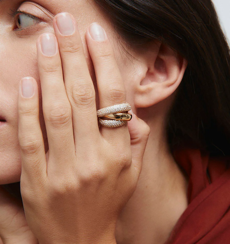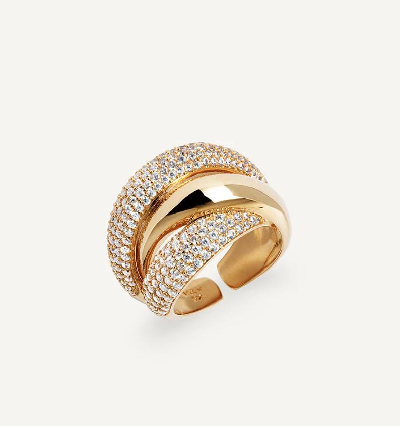 Anillo ancho cruzado Délum bañado con una gruesa capa de oro macizo de 18 kt, lo que garantiza una mayor durabilidad. Engastado con circonitas blancas, cuya similitud con el diamante es casi indistinguible.