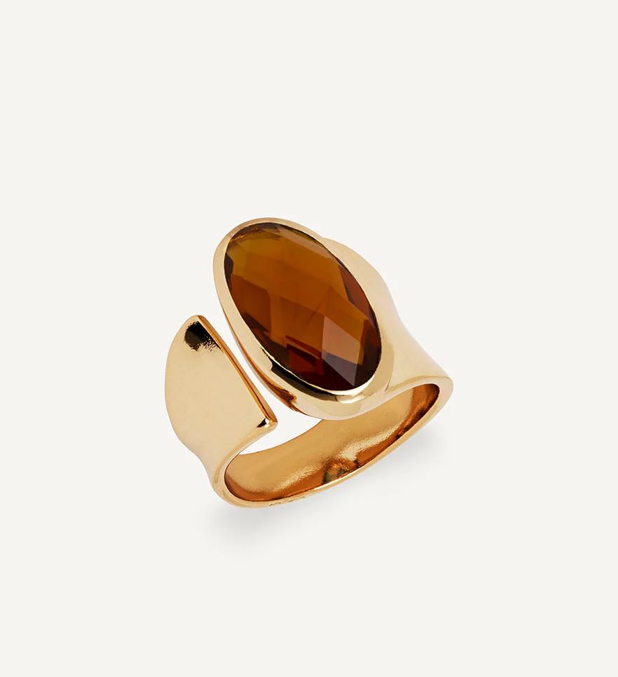 Anillo ancho Honey bañado con una gruesa capa de oro macizo de 18 kt, lo que garantiza una mayor durabilidad. Destaca por su piedra semipreciosa Honey Hydro en tono marrón.