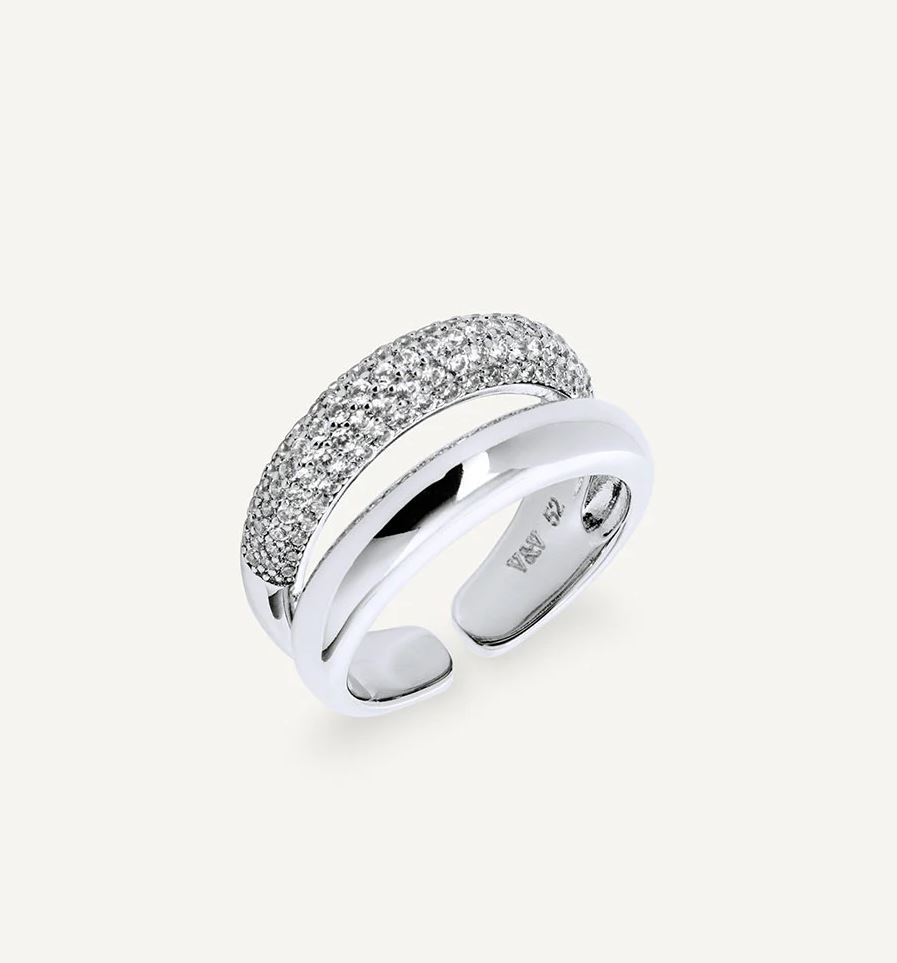Anillo dúo abierto Allure bañado con una gruesa capa de Plata de ley 925, lo que garantiza una mayor durabilidad. Engastado con circonitas blancas, cuya similitud con el diamante es casi indistinguible.