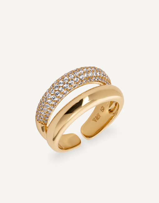 Anillo dúo abierto Allure bañado con una gruesa capa de oro macizo de 18 kt, lo que garantiza una mayor durabilidad. Engastado con circonitas blancas, cuya similitud con el diamante es casi indistinguible.