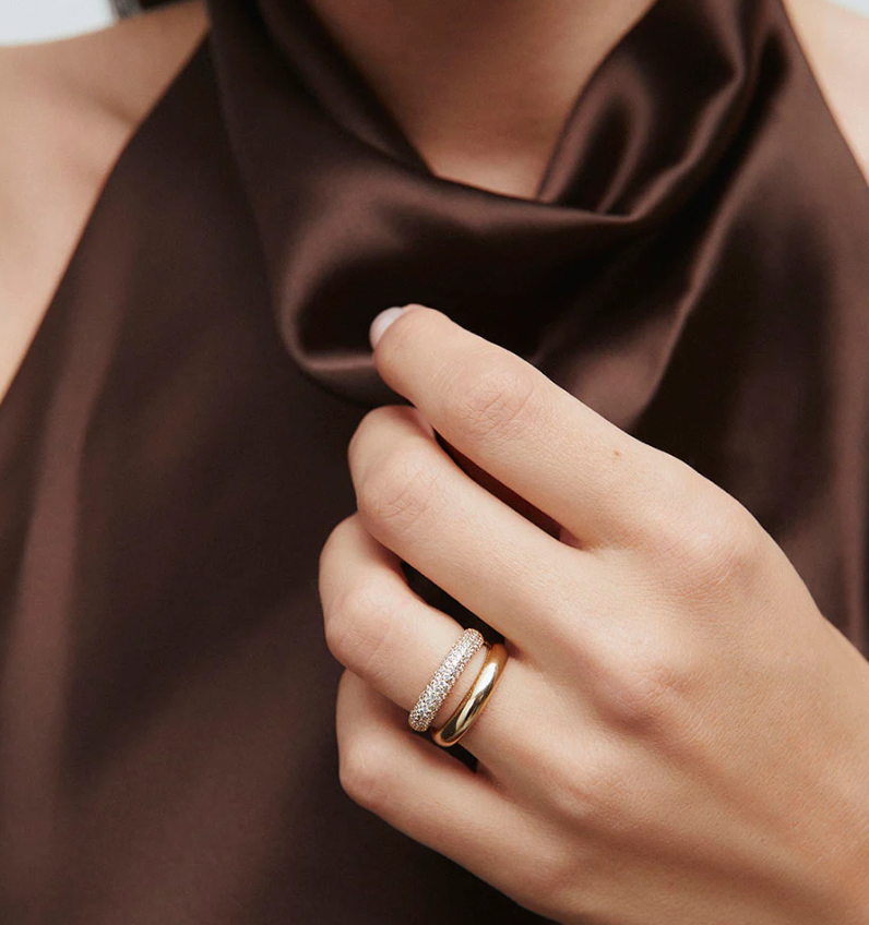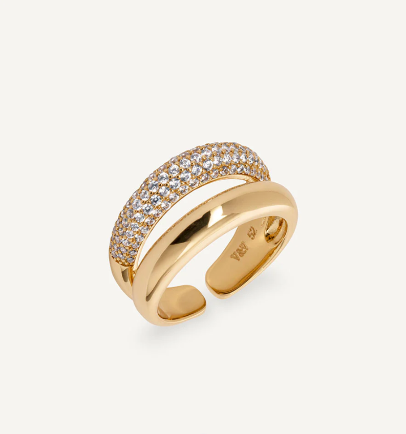 Anillo dúo abierto Allure bañado con una gruesa capa de oro macizo de 18 kt, lo que garantiza una mayor durabilidad. Engastado con circonitas blancas, cuya similitud con el diamante es casi indistinguible.