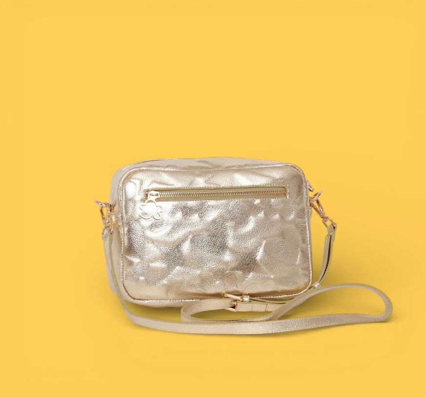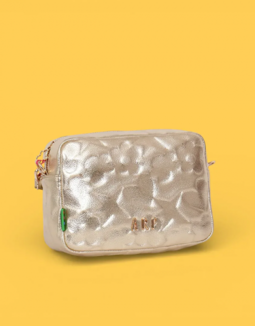 Bandolera con grabado de iconos en acabado platino. Diseño elegante y versátil que combina funcionalidad con estilo contemporáneo. Perfecta para llevar tus esenciales con un toque sofisticado. Correa ajustable para mayor comodidad. Un accesorio imprescindible que refleja tu personalidad y buen gusto.