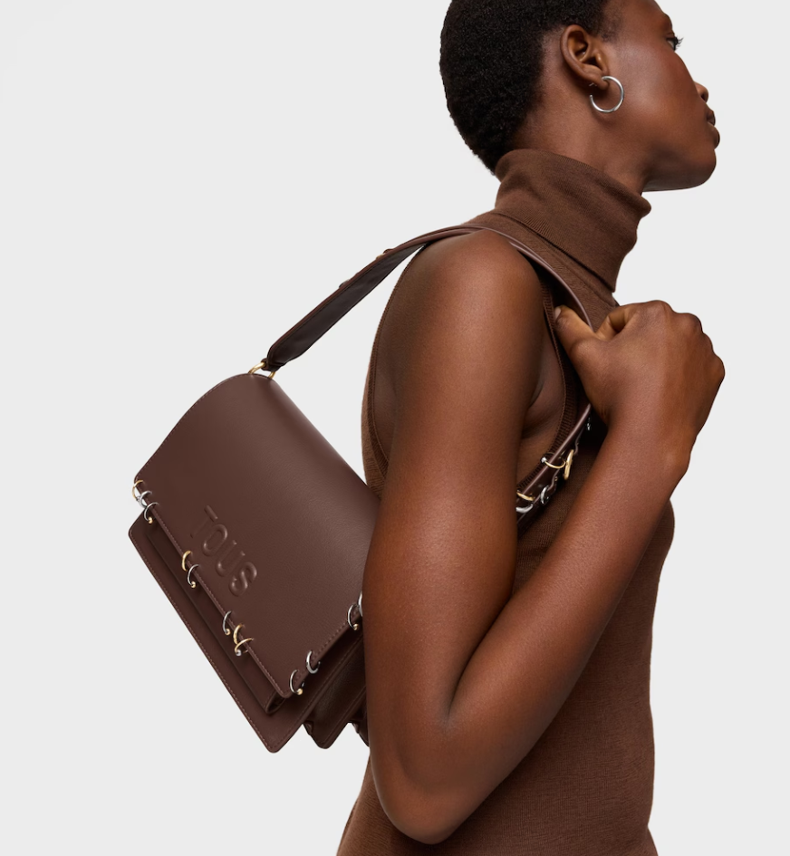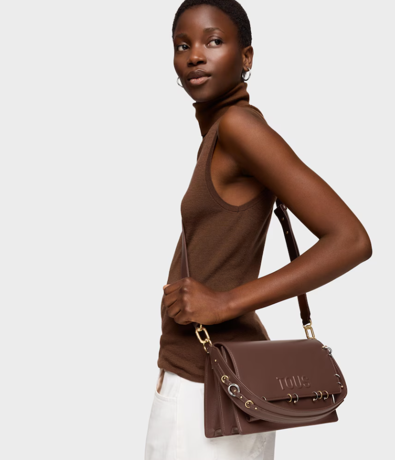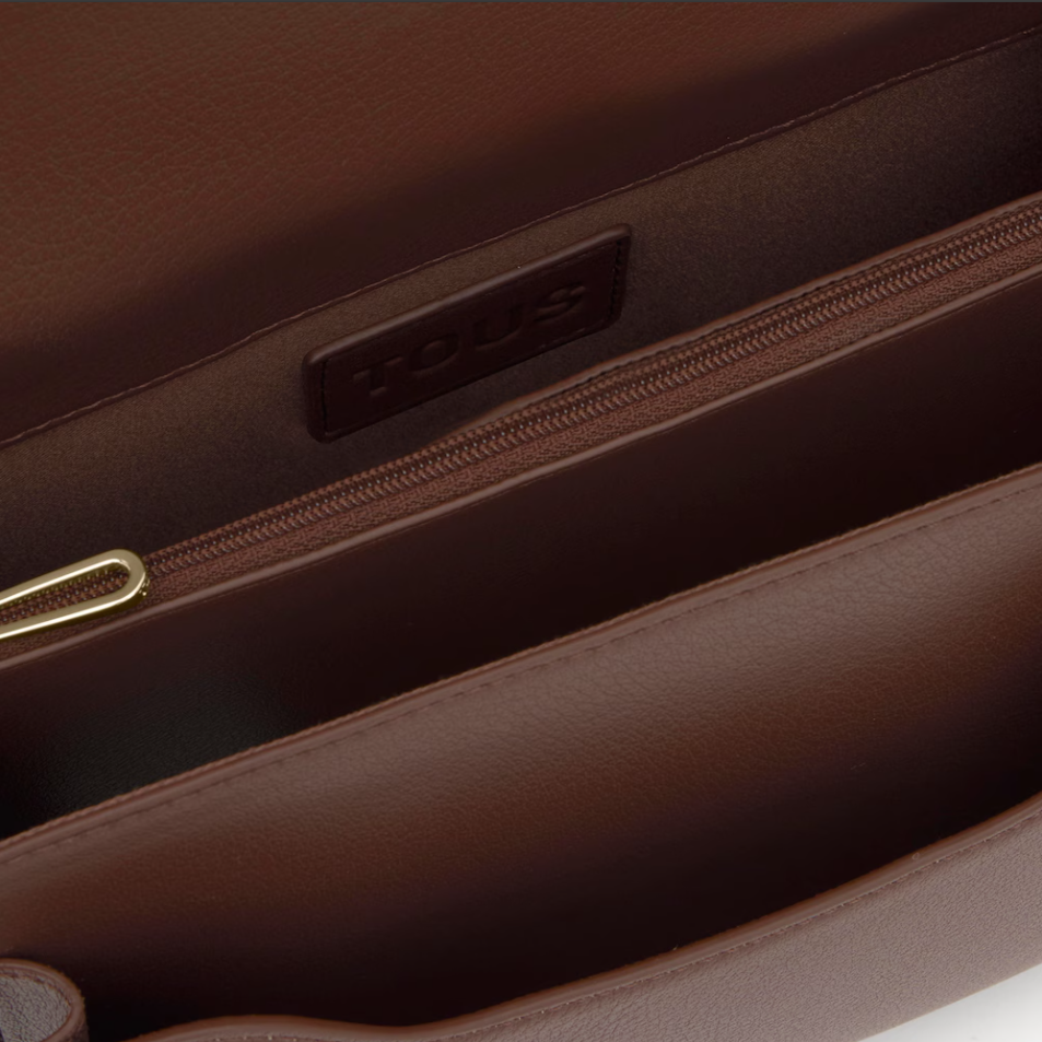 Bolso bandolera mediano Audree Earrings de poliuretano en color marrón. Cierre de solapa con botones magnéticos. Bolsillo exterior abierto. Tiene dos compartimentos separados por uno con cremallera. Asa bandolera ajustable y desmontable y asa de hombro desmontable. Medidas (alto x ancho x fondo): 17 x 25 x 12 cm.