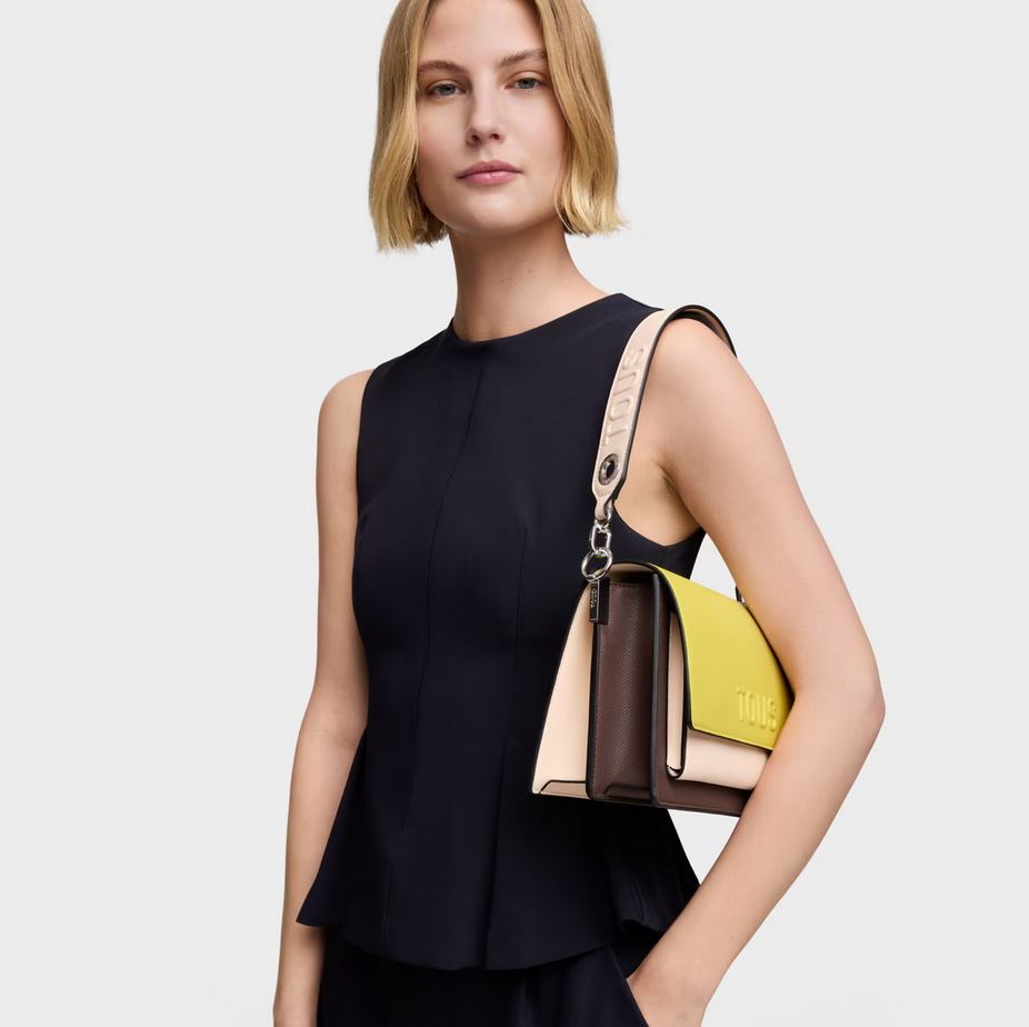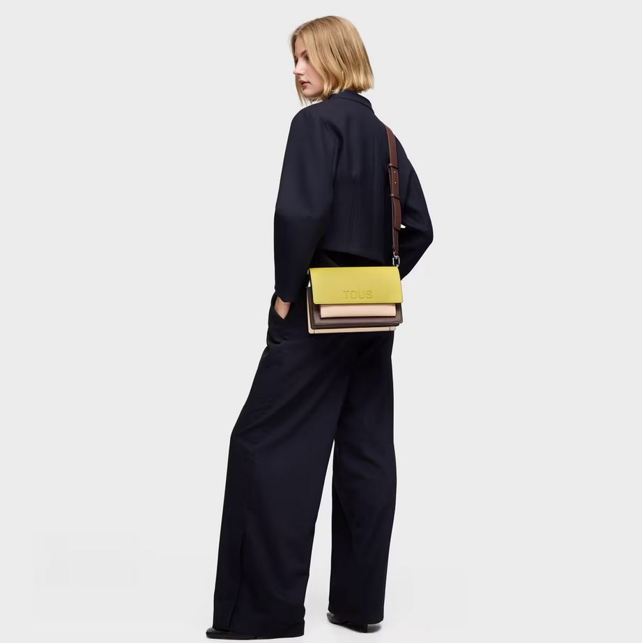 Bolso bandolera mediano Audree Saffiano de poliuretano en color lima y nude. Cierre de solapa con cierre de botón magnético. Dos compartimentos separados por otro compartimento con cierre de cremallera y bolsillo abierto en la parte delantera. Asa de hombro desmontable y asa bandolera ajustable y desmontable. Medidas (alto x ancho x fondo): 16 x 25 x 11 cm.