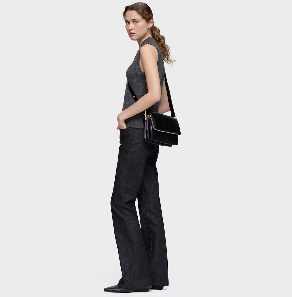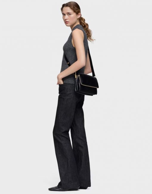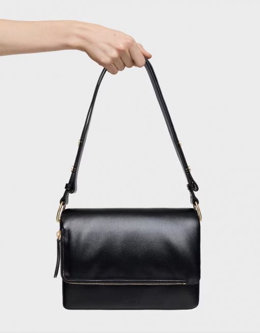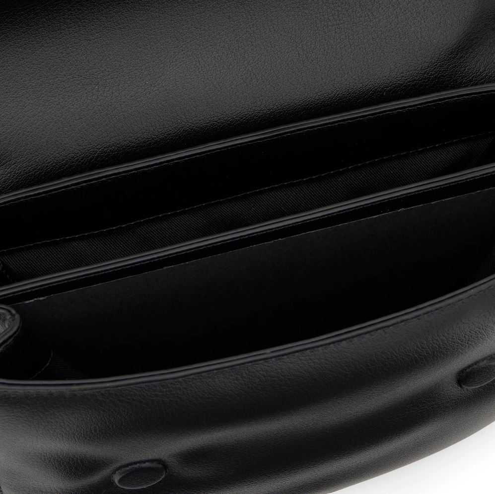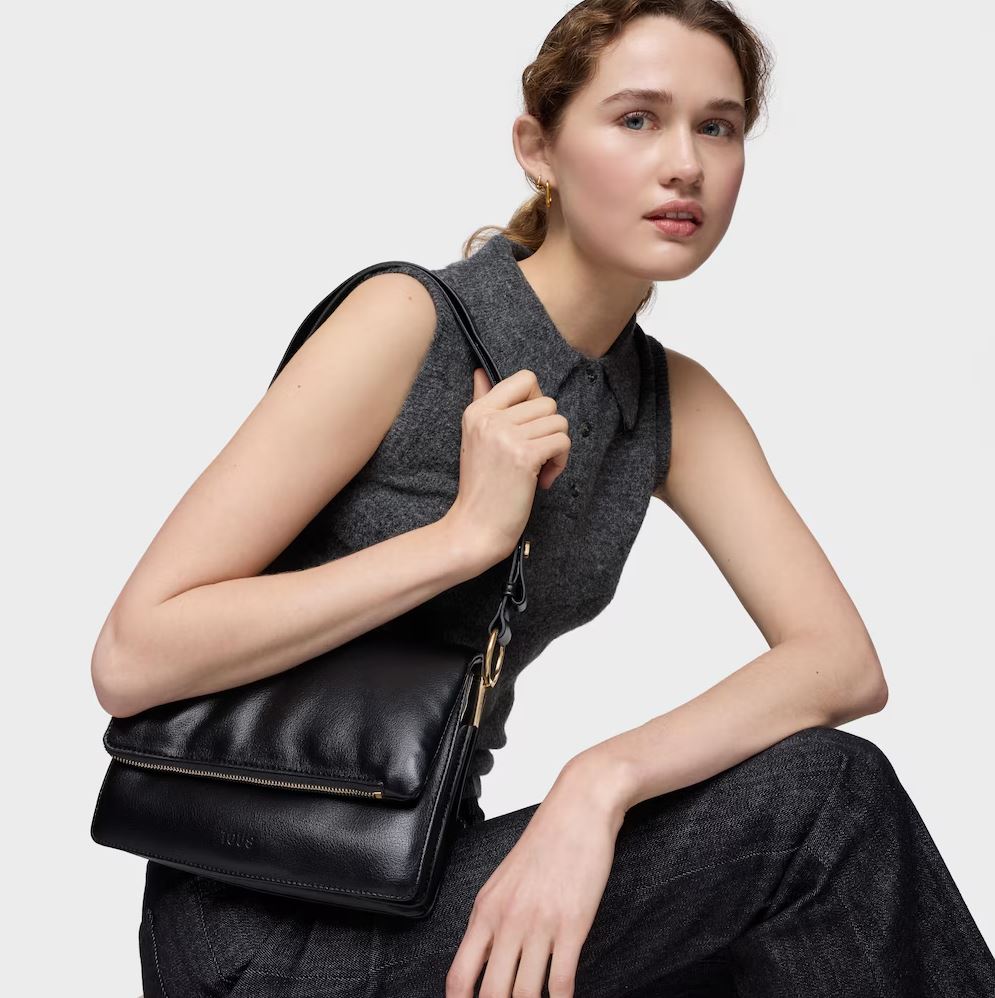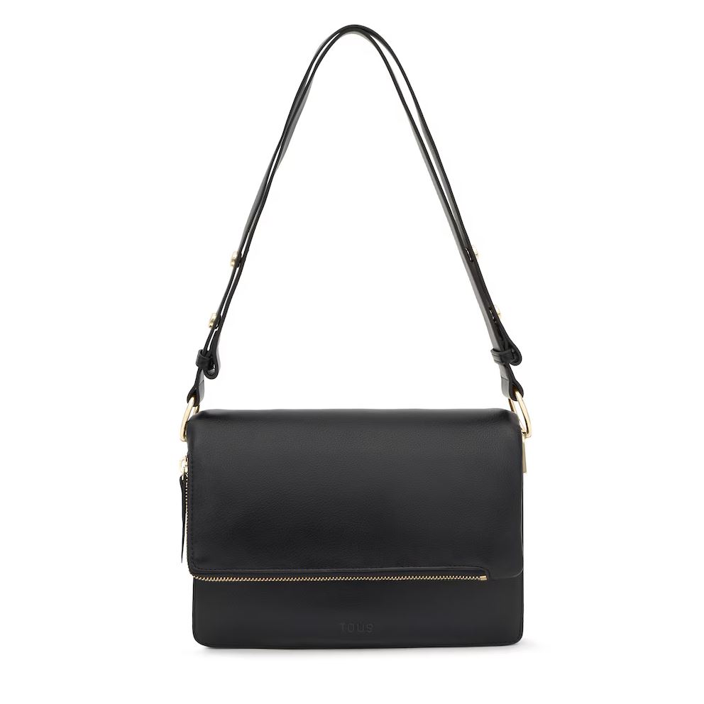 Bandolera mediana Audree Soft en color negro. Cierre de solapa magnética. Bolsillo interior abierto. Dos compartimentos abiertos en el interior. Asa bandolera ajustable a asa de hombro. Medidas (alto x ancho x fondo): 17 x 25 x 10 cm.