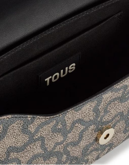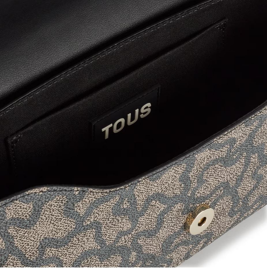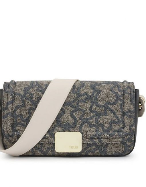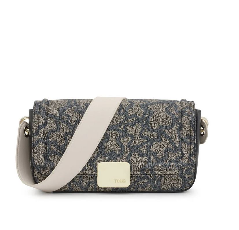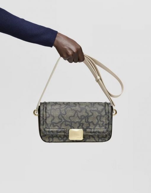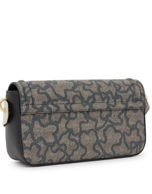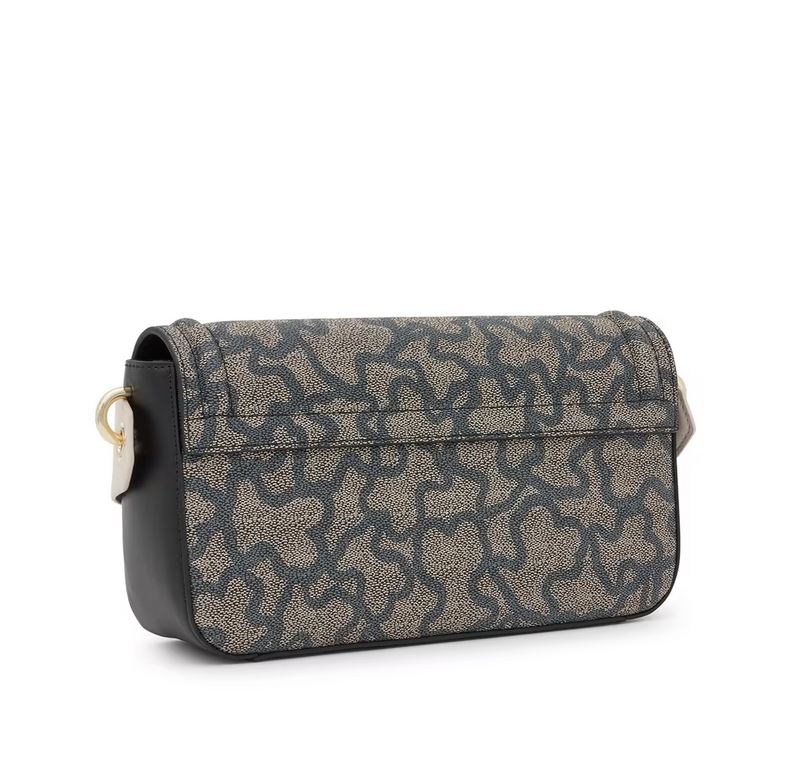 Bolso bandolera mediano de lona con estampado Kaos en color negro y detalles en piel sintética. Cierre de solapa con botón magnético. Bolsillo interior abierto. Asa bandolera ajustable. Medidas (alto x ancho x fondo): 13,5 x 26,5 x 7 cm.
