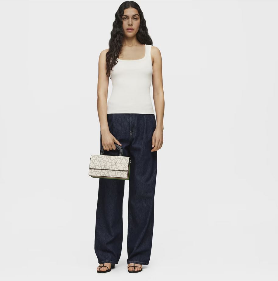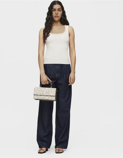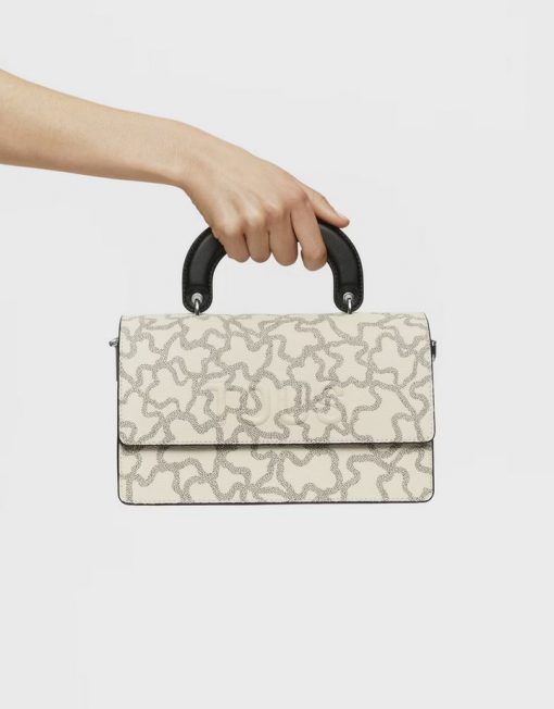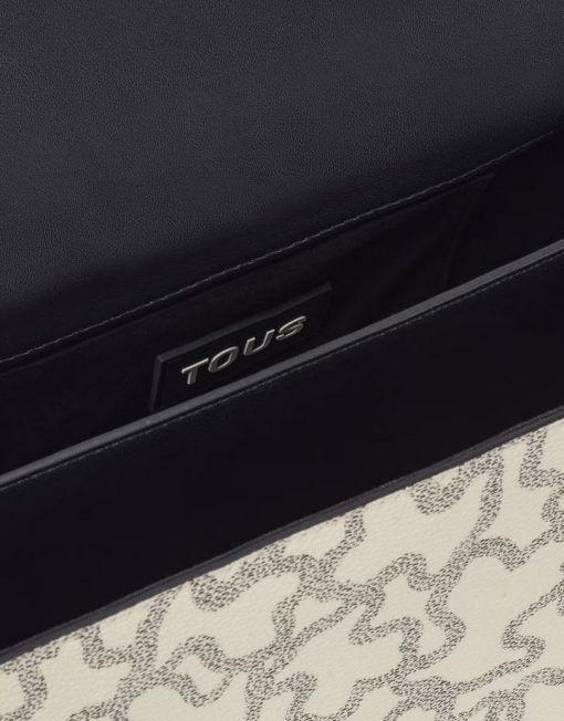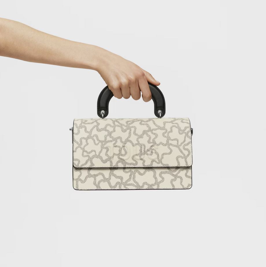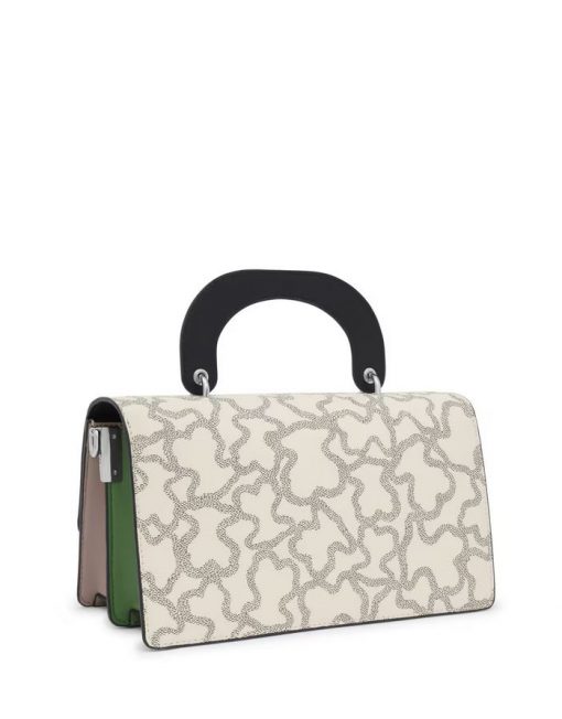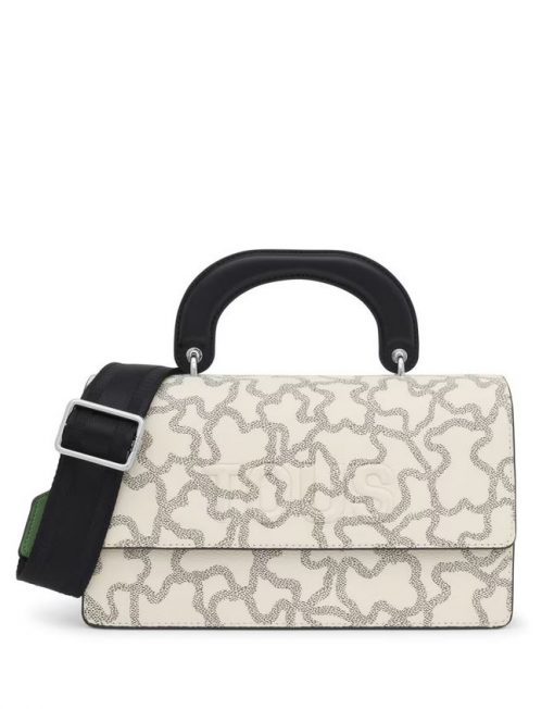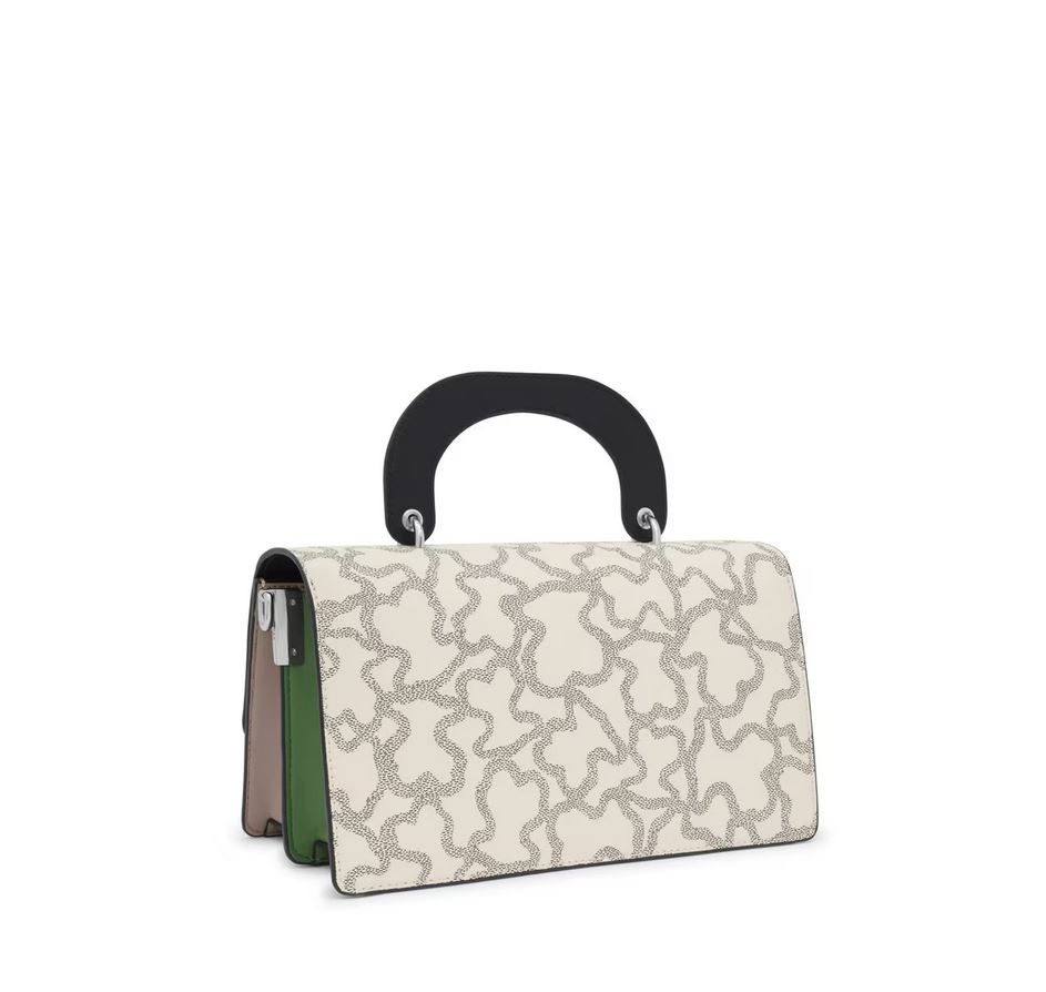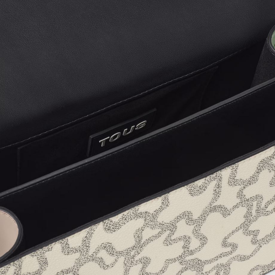 Bolso bandolera mediano de solapa de lona con estampado en color topo y verde y detalles en piel sintética Kaos Icon. Cierre de botones magnéticos. Dos compartimentos. Bolsillo interior abierto. Asa fija de mano y asa bandolera ajustable y desmontable. Medidas (alto x ancho x fondo): 14 x 25 x 13 cm.