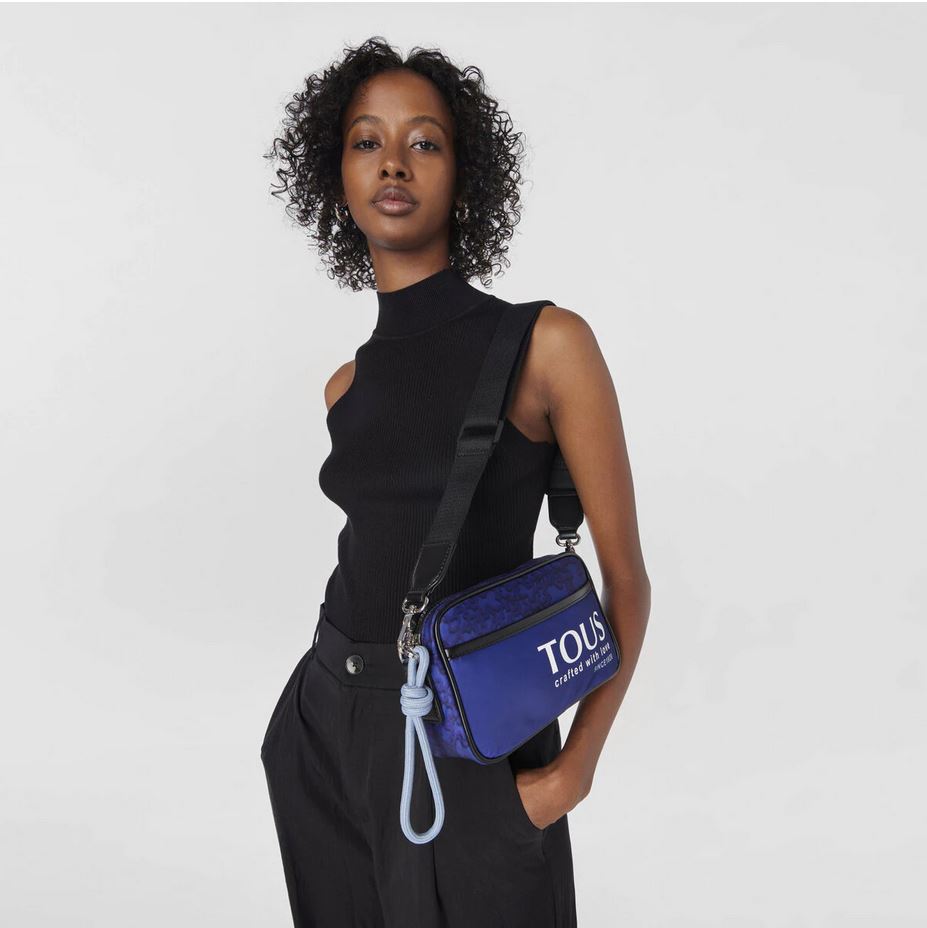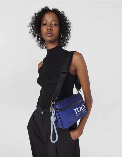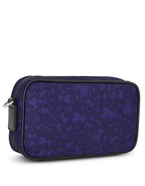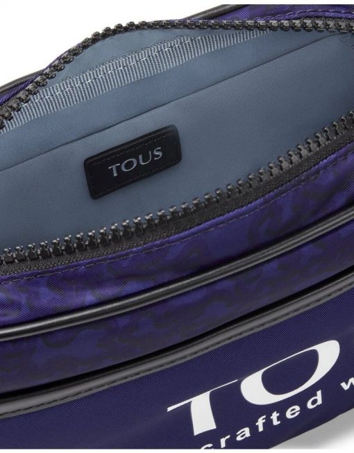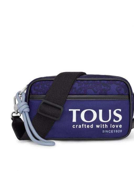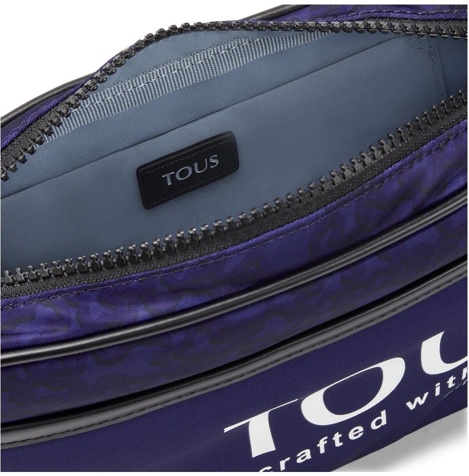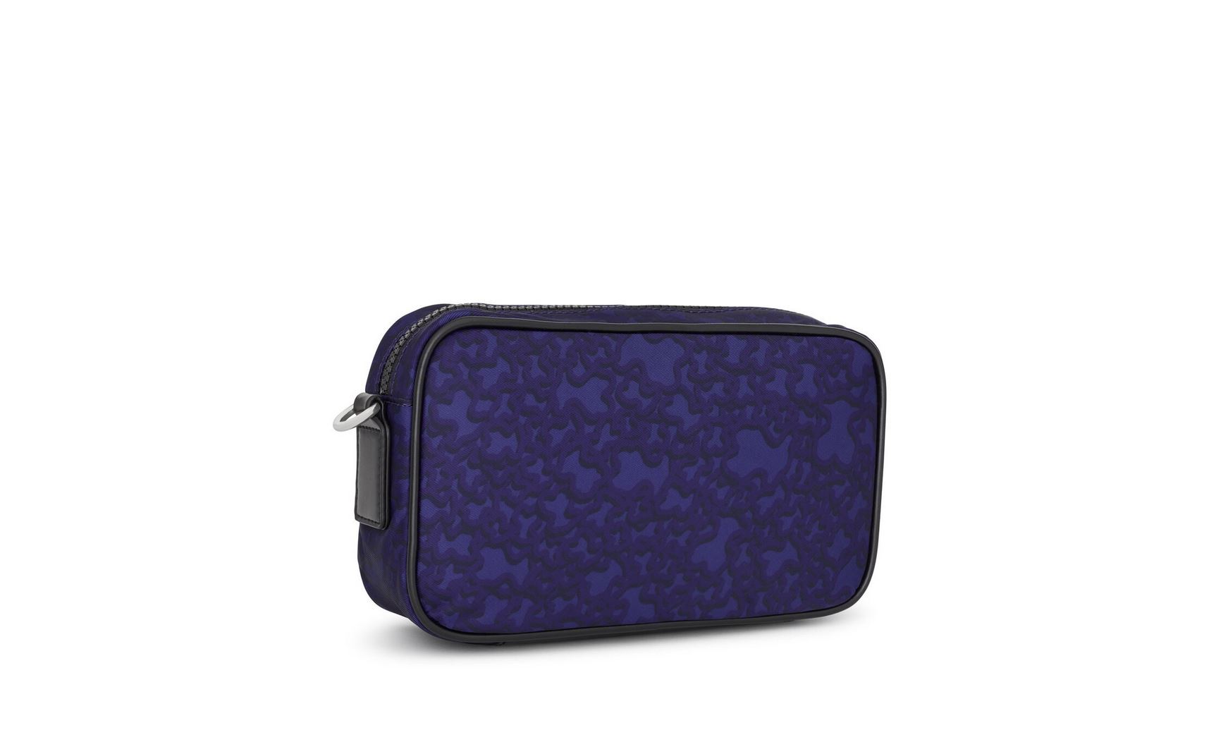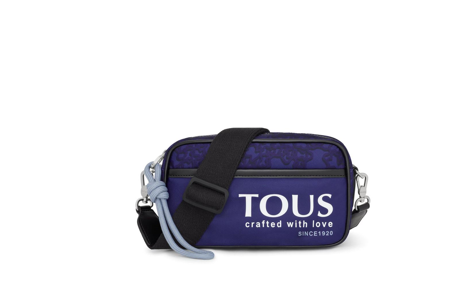 Bolso bandolera reporter TOUS Kaos Mini Evolution en color morado de nylon reciclado combinado con detalles de piel sintética. Bandolera con cierre de cremallera, bolsillo exterior abierto y bolsillo interior. Asa ajustable y extraíble con ganchos. Medidas (alto x ancho x fondo): 13 x 22 x 6 cm.