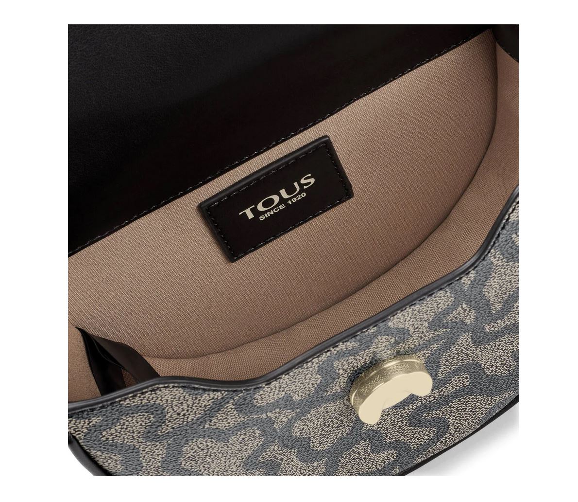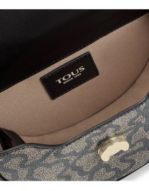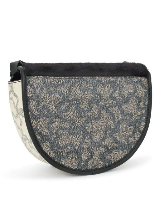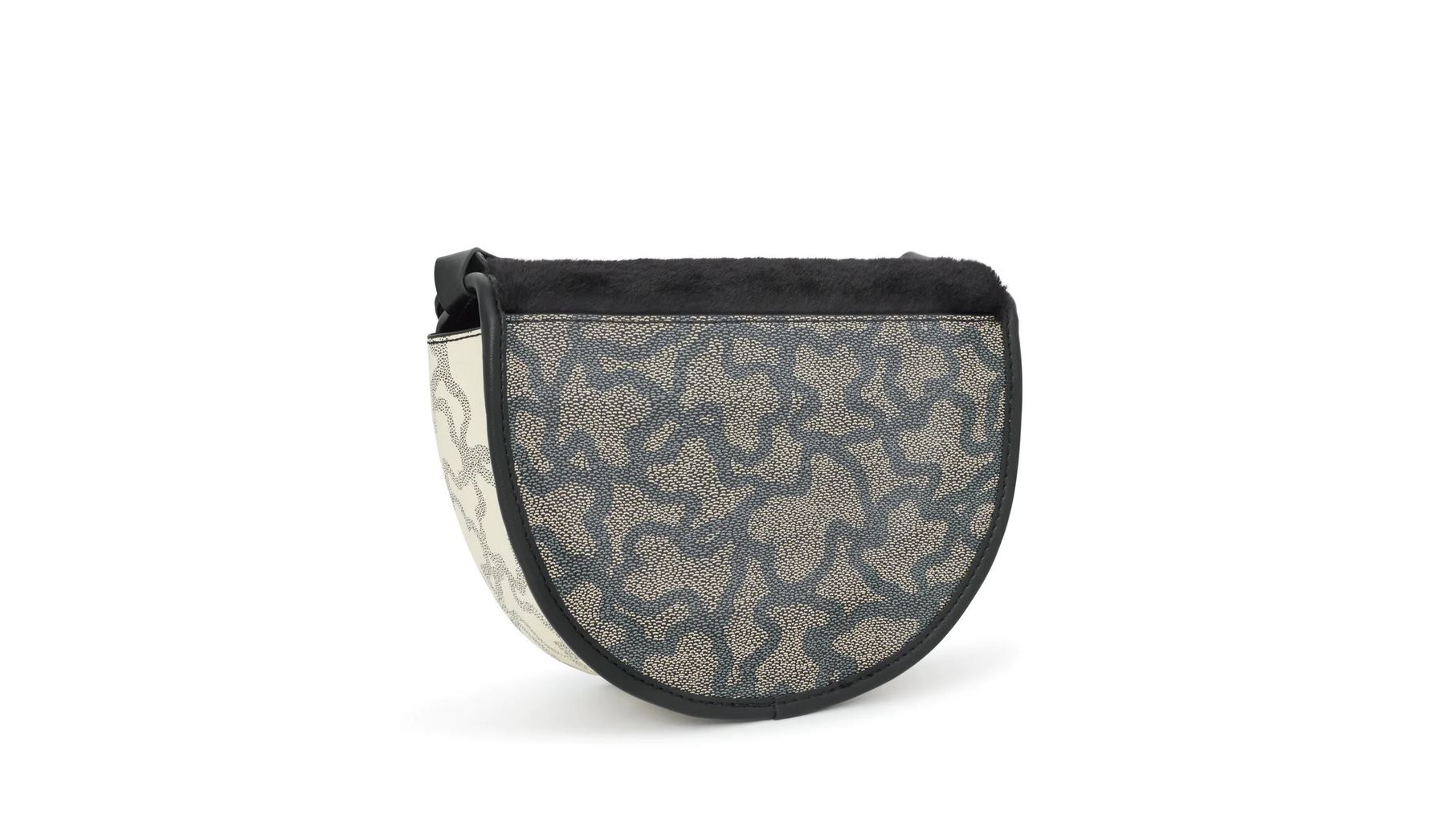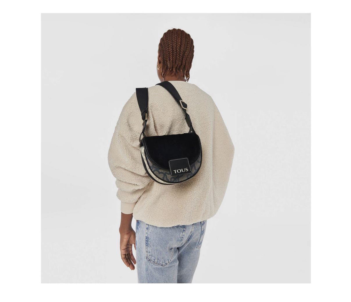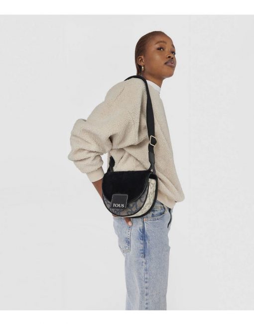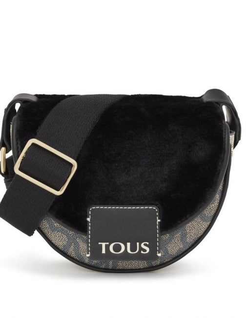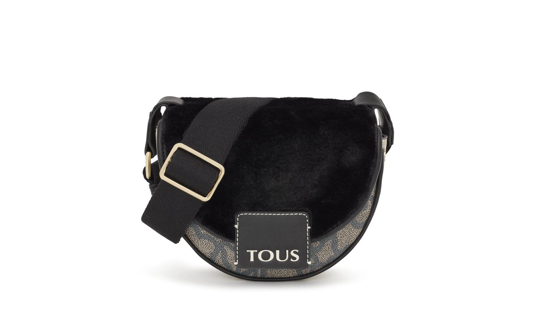 Bolso bandolera pequeño TOUS de la colección Amaya Kaos Icon en forma de media luna de pelo sintético combinado con lona en color negro y pulido con un vivo de piel sintética. Cierre de solapa con botón metálico encajable. Asa larga ajustable. Medidas (alto x ancho x fondo): 15,2 x 21 x 7,6 cm.