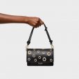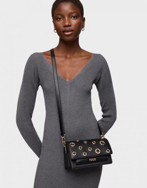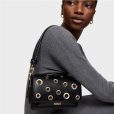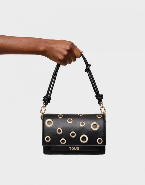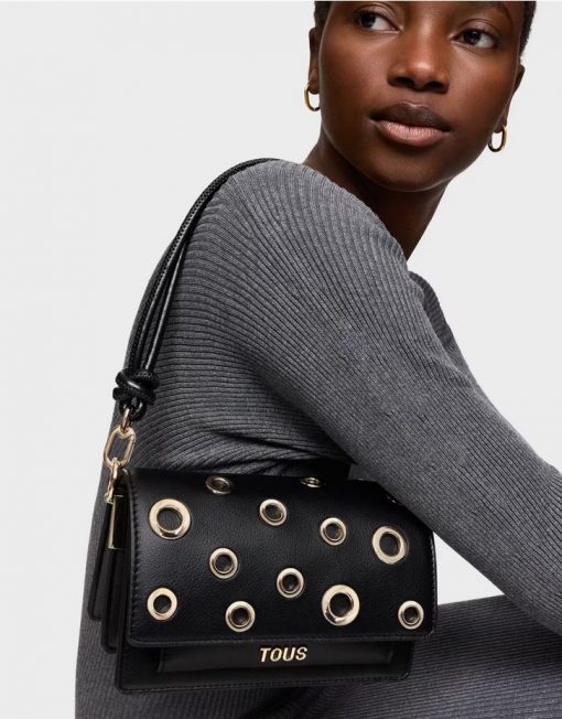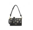 Bolso bandolera pequeño Audree Eyelets de poliuretano en color negro. Cierre de solapa con botones magnéticos. Bolsillo abierto en la parte delantera y dos compartimentos abiertos en el interior. Asa bandolera ajustable y extraíble y asa de hombro extraíble. Medidas (alto x ancho x fondo): 12 x 20 x 10,5 cm.