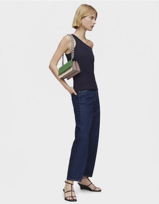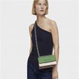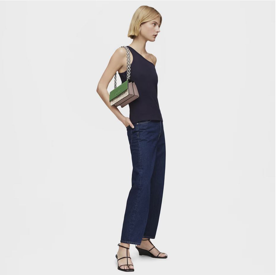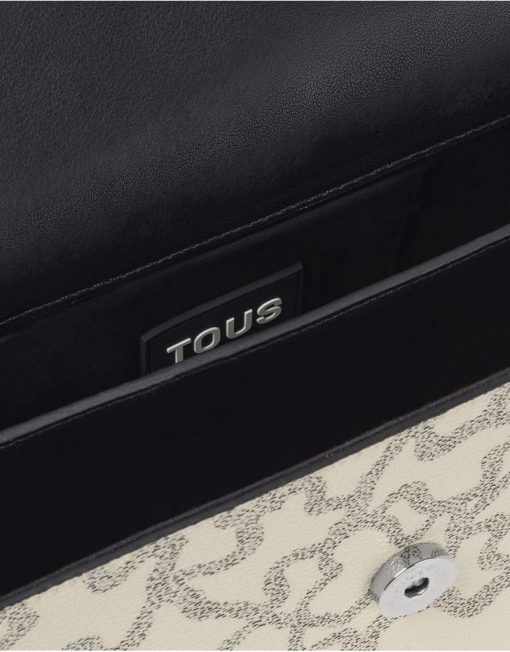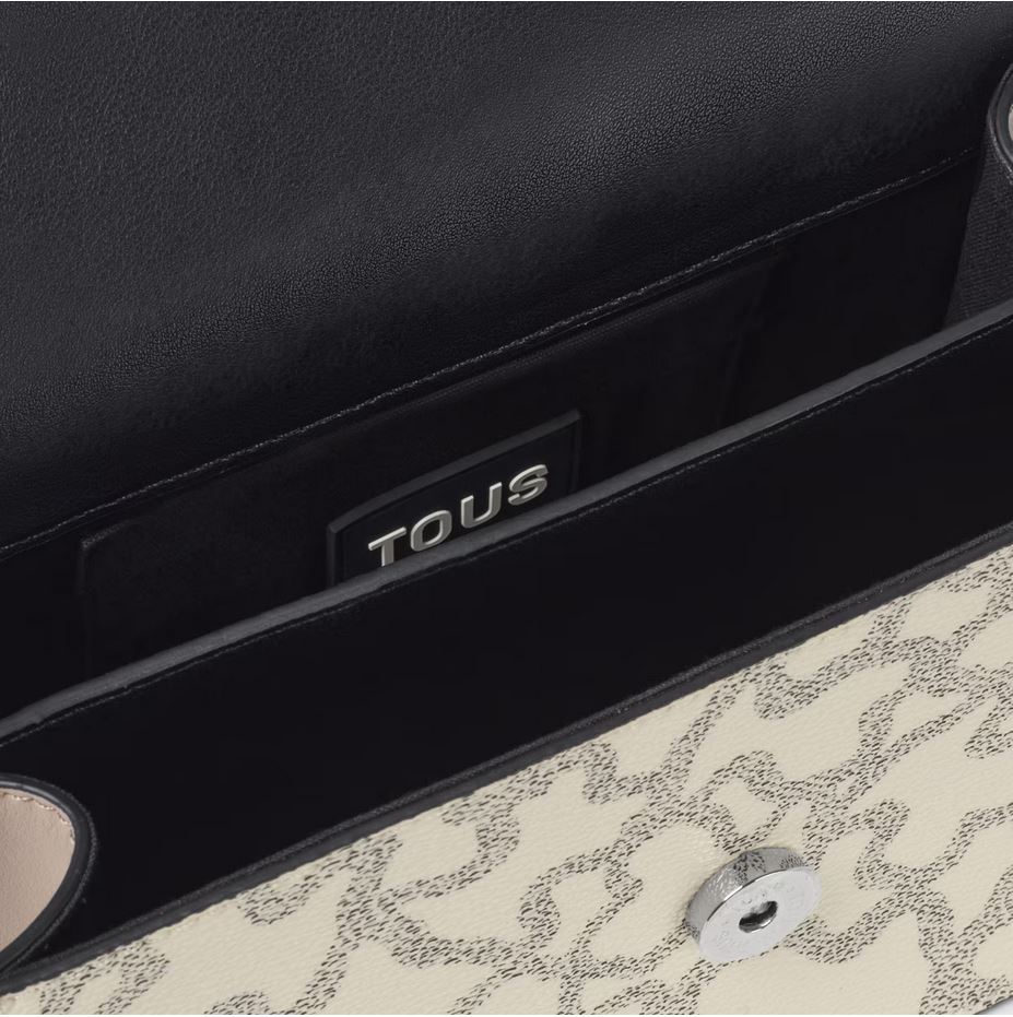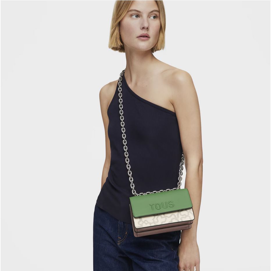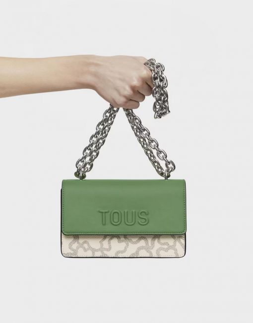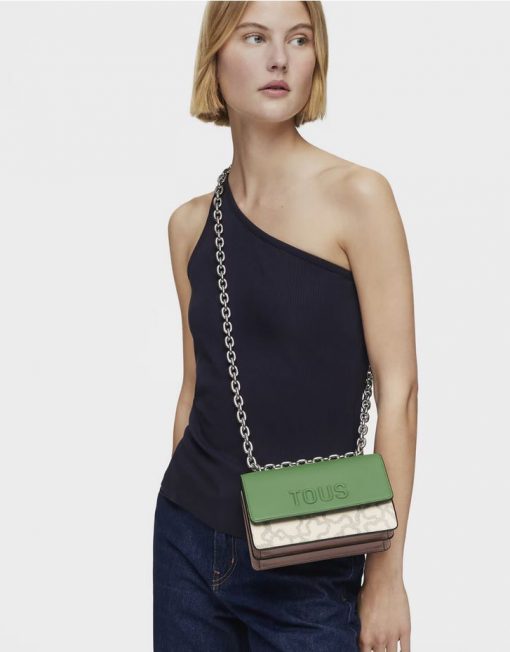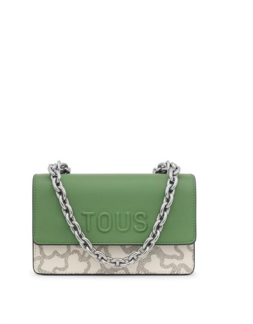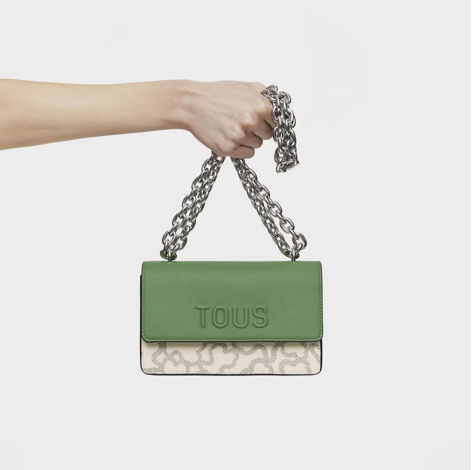 Bolso bandolera pequeño con solapa en color topo y verde con estampado Kaos Icon. Cierre de solapa con botones magnéticos. Separado en dos compartimentos, uno de ellos con bolsillo interior abierto. Asa bandolera ajustable. Medidas (alto x ancho x fondo): 11 x 20 x 10,5 cm.