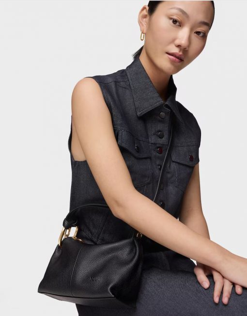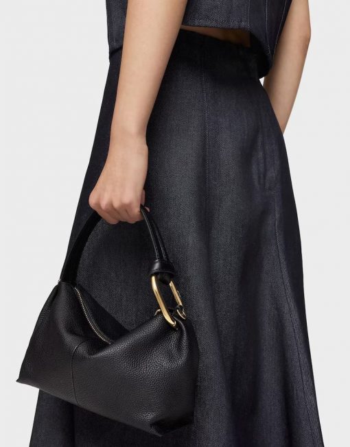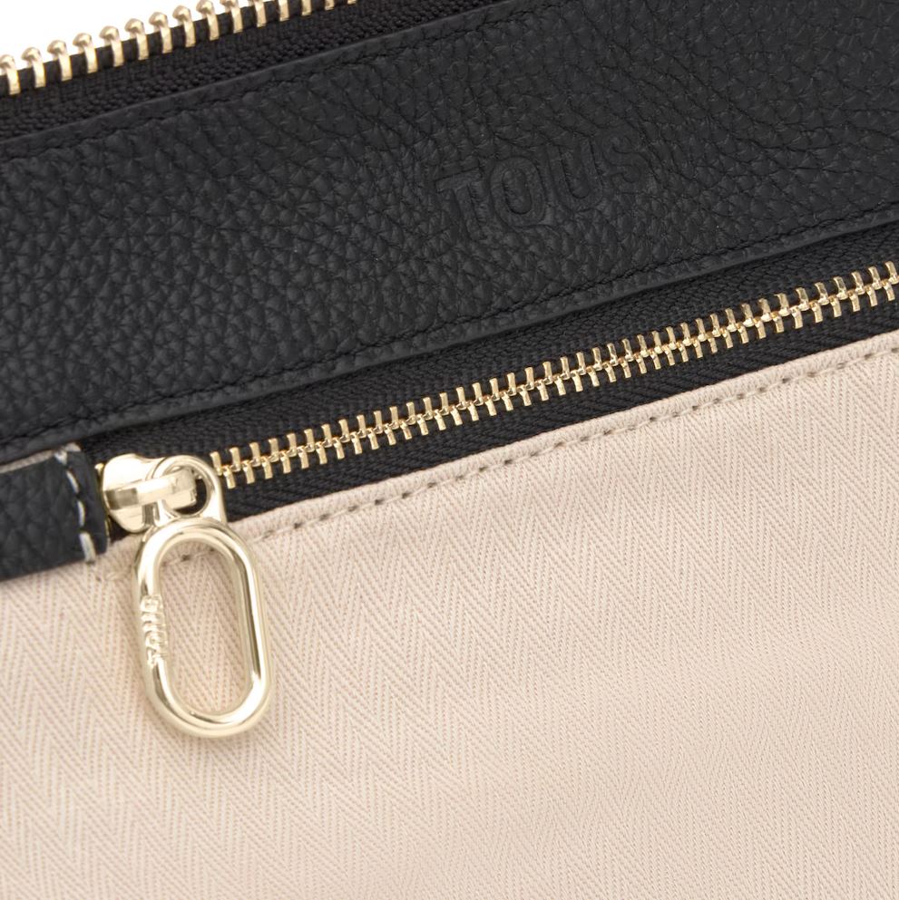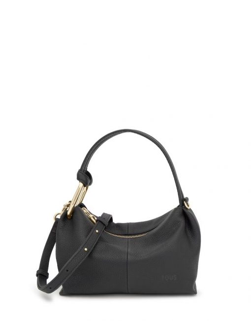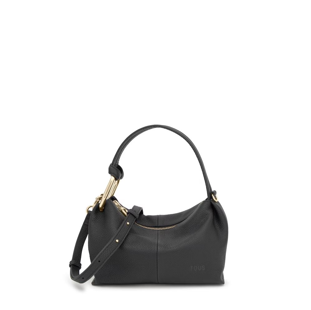 Bolso Bandolera de piel pequeña TOUS Hold de piel vacuna con certificación LWG en color negro. Cierre de cremallera. Bolsillo interior cremallera. Asa de hombro fija y Bandolera de piel ajustable. Medidas (alto x ancho x fondo): 16,5 x 23 x 7 cm.