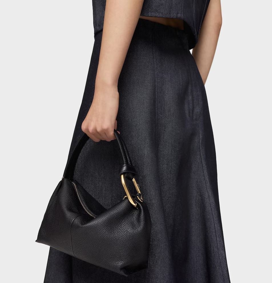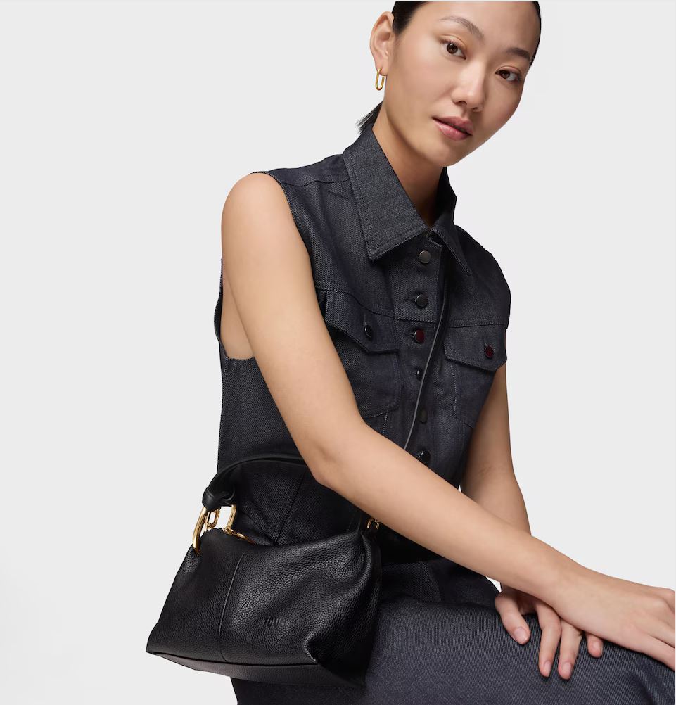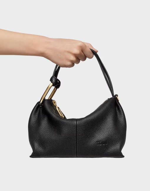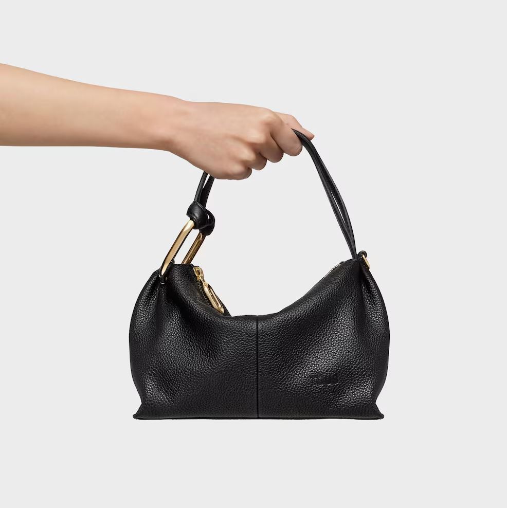 Bolso Bandolera de piel pequeña TOUS Hold de piel vacuna con certificación LWG en color negro. Cierre de cremallera. Bolsillo interior cremallera. Asa de hombro fija y Bandolera de piel ajustable. Medidas (alto x ancho x fondo): 16,5 x 23 x 7 cm.