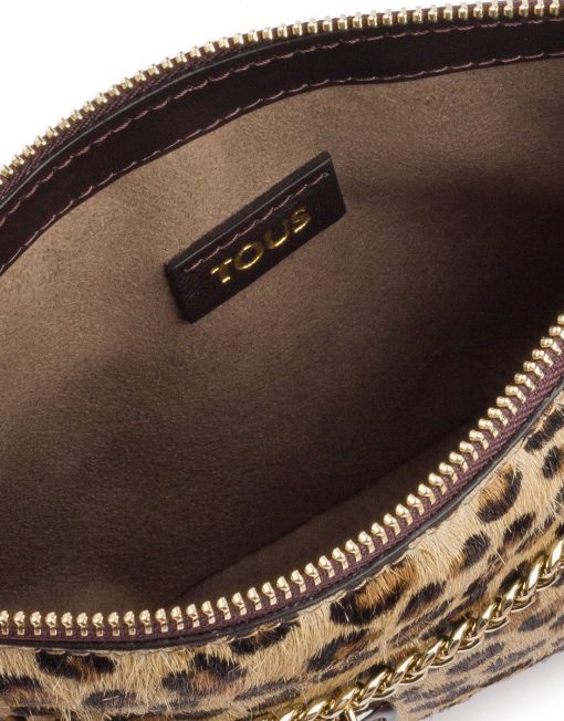 Bolso bandolera TOUS colección New Liz Pendants Wild de piel negra combinada con pelo multicolor. Cierre con cremallera. Apliques personalizados en tonos dorado pálido y negro. Asa de bandolera ajustable. Medidas: 15,5x25x4 cm.