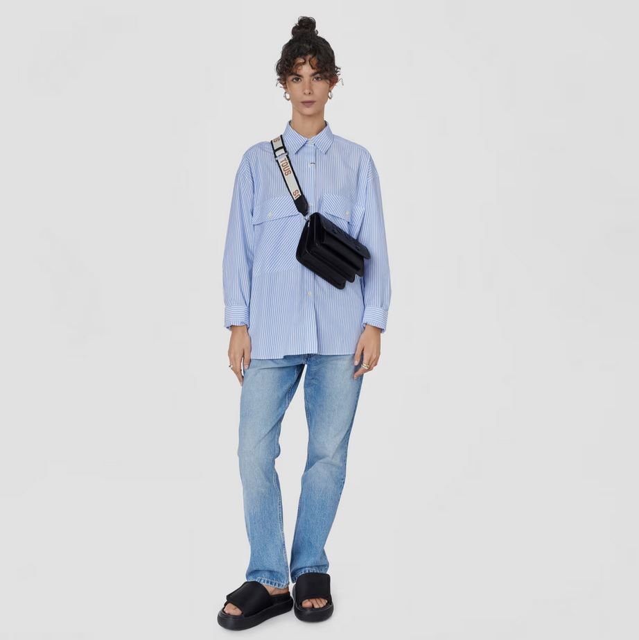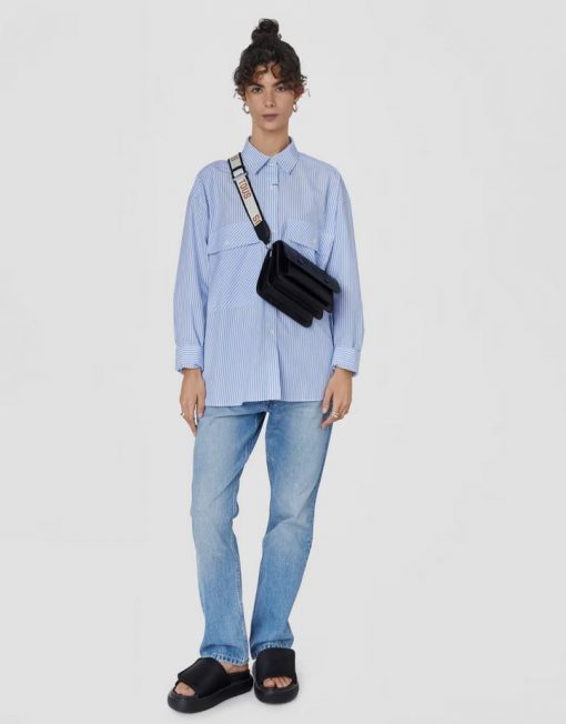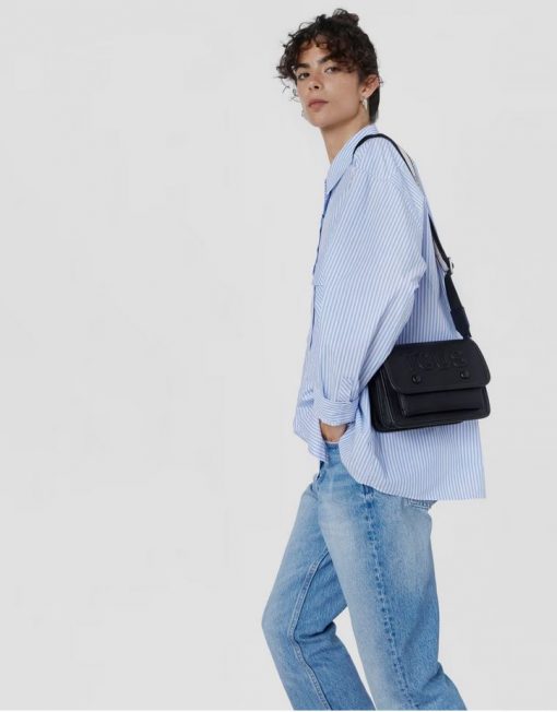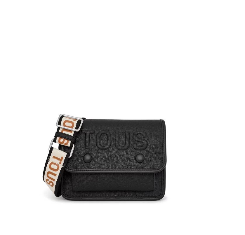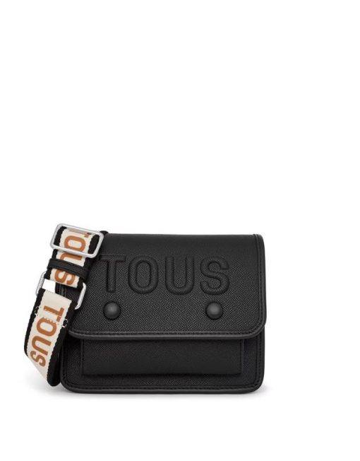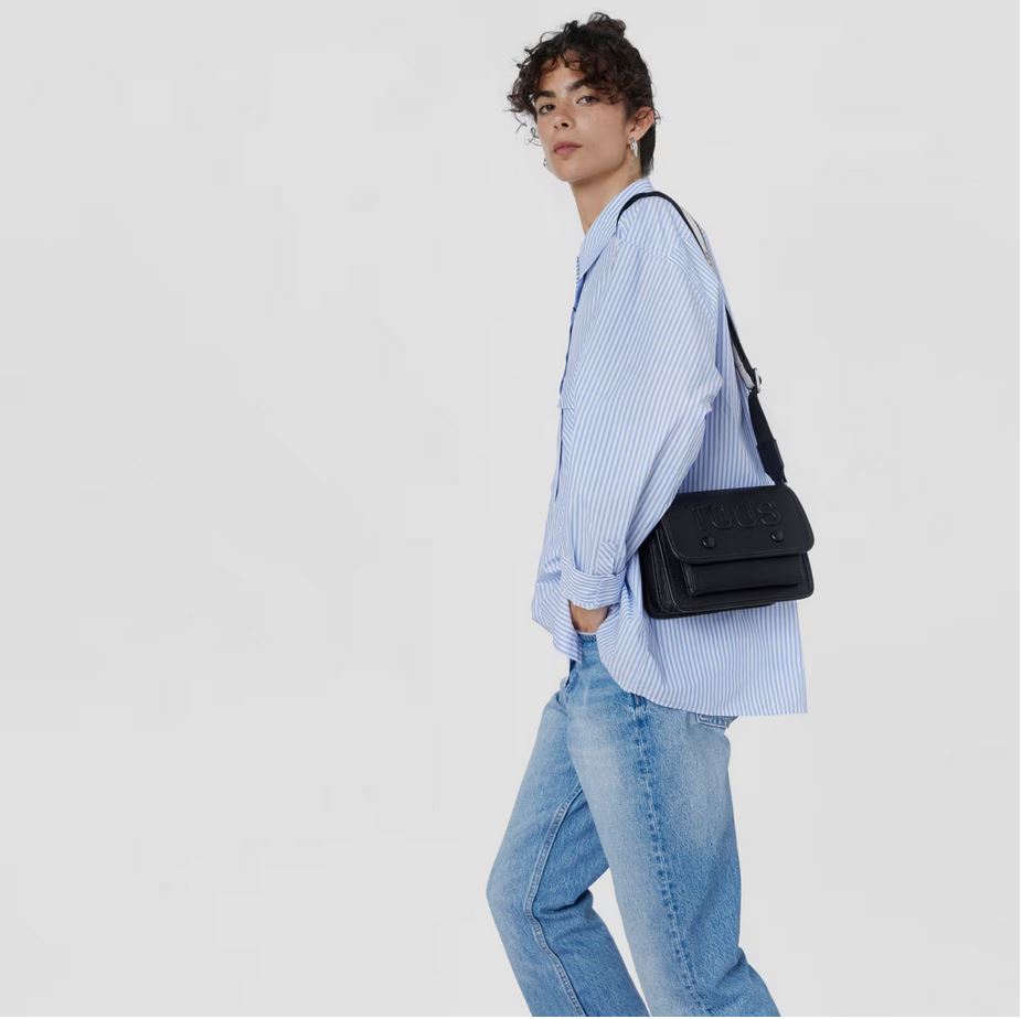 Bolso bandolera pequeño Audree TOUS La Rue de piel sintética con vivo de piel vacuna en color negro. Cierre de solapa con dos botones magnéticos. Bolso con un bolsillo abierto en la parte delantera y dos compartimentos abiertos en el interior. Asa bandolera ajustable. Medidas (alto x ancho x fondo): 15 x 20 x 12 cm.